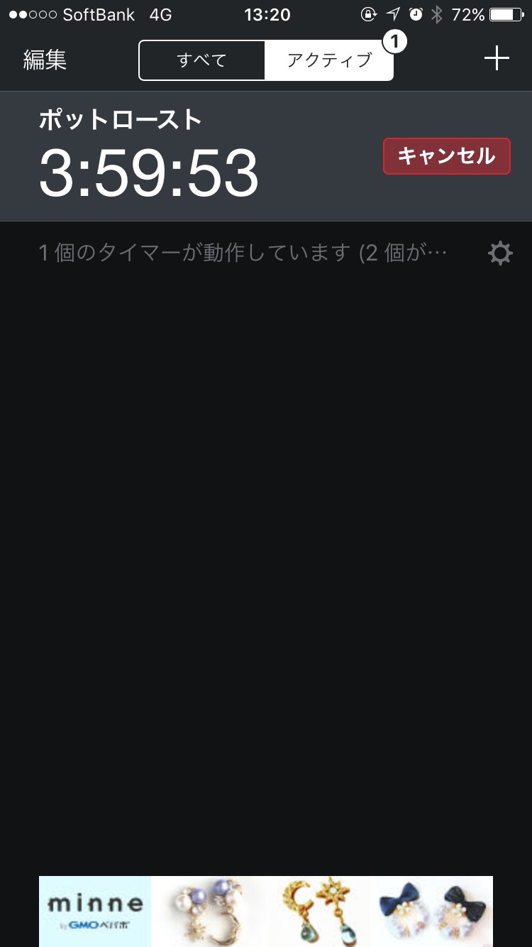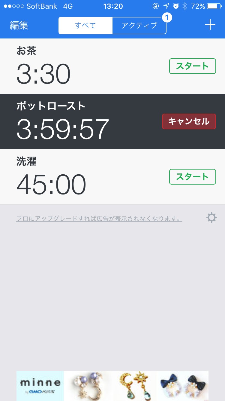 「Timer+」のアプリ画面は単純で、どれか一つでもタイマーを作動させると「アクティブ」のタブに現在動いているタイマーが表示されるだけです。