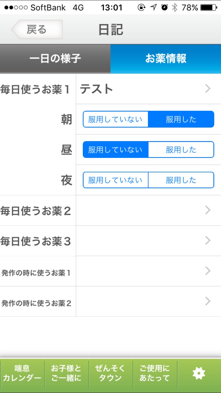 その日に発作やせきがあった場合は、記録画面のそれぞれの「あり・なし」を切り替えて記録しましょう。