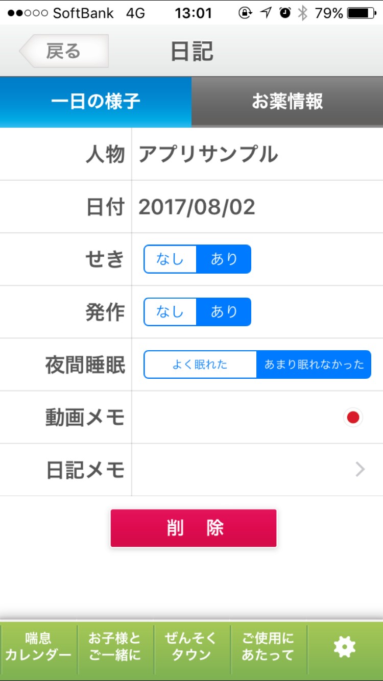 「喘息ダイアリー」を利用すれば、親御さんが観察した喘息の記録を逐一残すことができます。