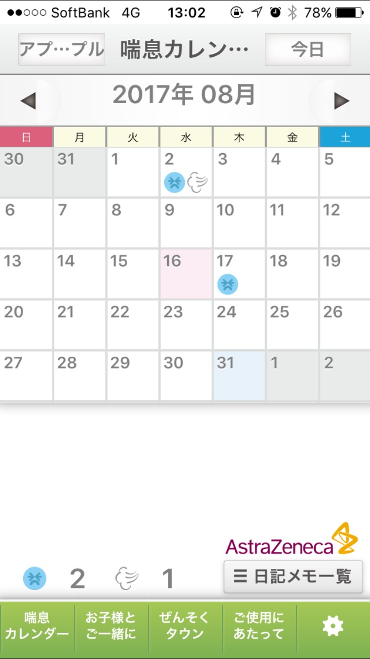「喘息ダイアリー」は喘息に関わる様々な物ごとをカレンダーで記録できるダイアリーアプリです。