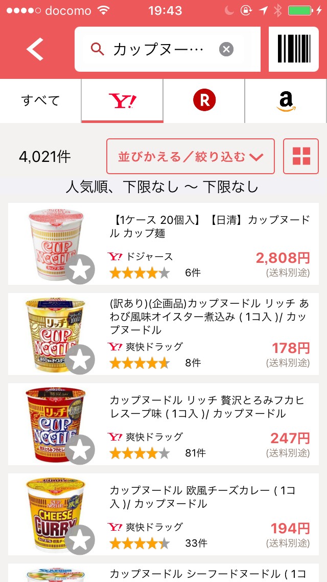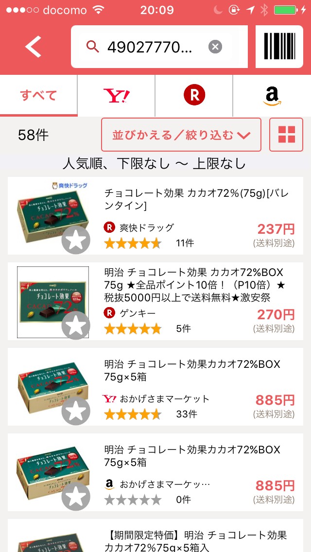 おすすめポイントの一つ目は検索した商品をアマゾン、ヤフーショッピング、楽天ショッピングで比較できることです。先ほどの説明のようにキーワードやバーコードからアマゾン、ヤフー、楽天それぞれで検索をかけられます。つまり「アマゾンでは100円」、「楽天では80円」、「ヤフーでは70円」といった具合に価格を比較して一番安いサイトから購入することができるのです。