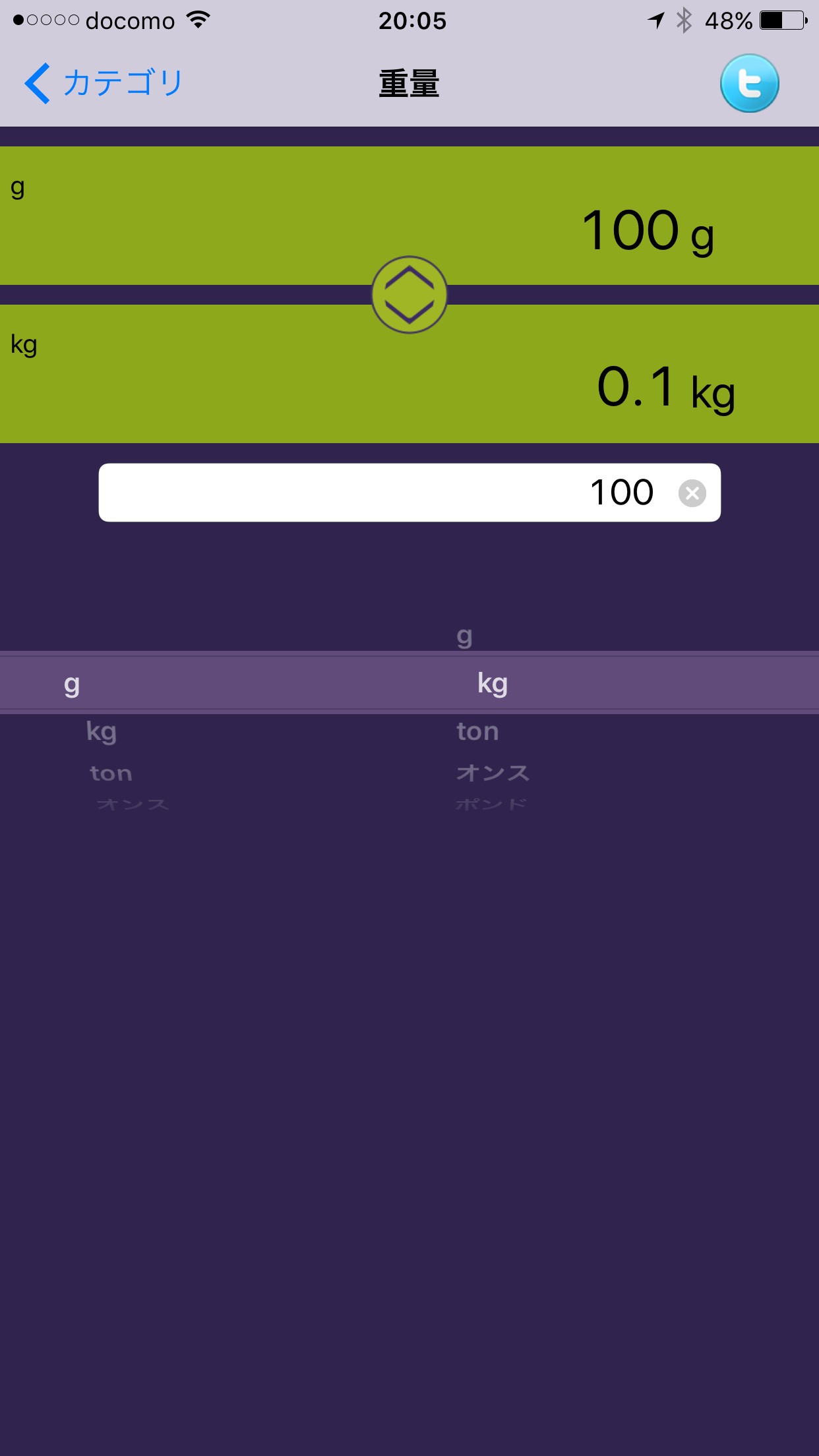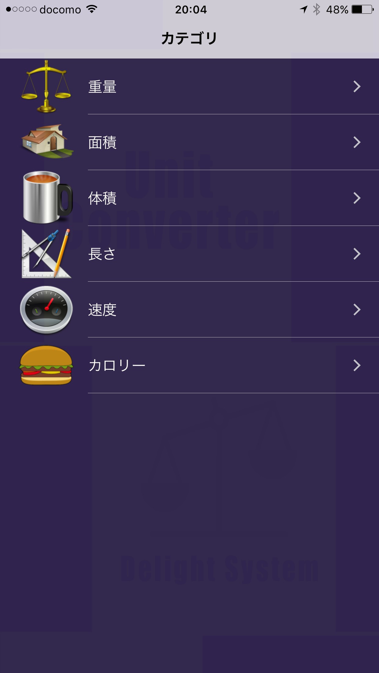 このアプリで変換できるカテゴリーは「重量」「面積」「体積」「長さ」「速度」「カロリー」の全部で6つです。