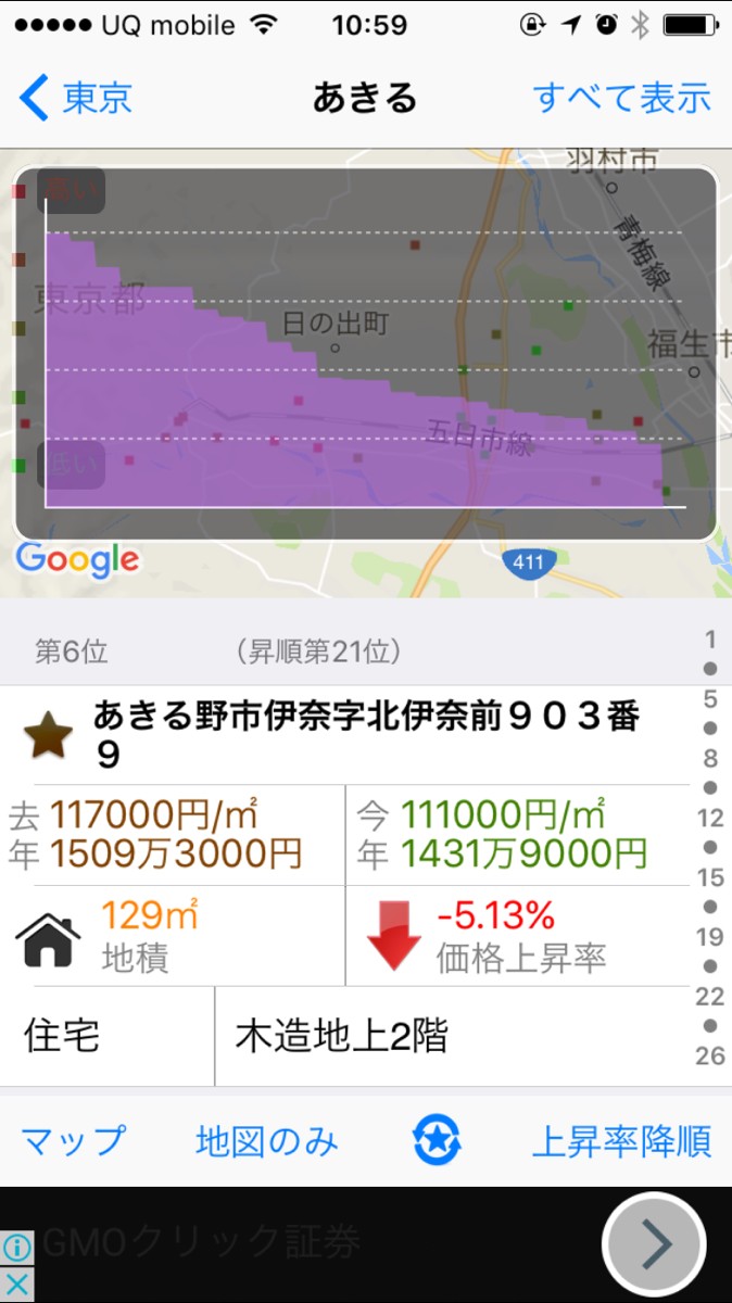 地価を知りたい地域を一覧から選択しタップすると、地図と情報が表示されます。