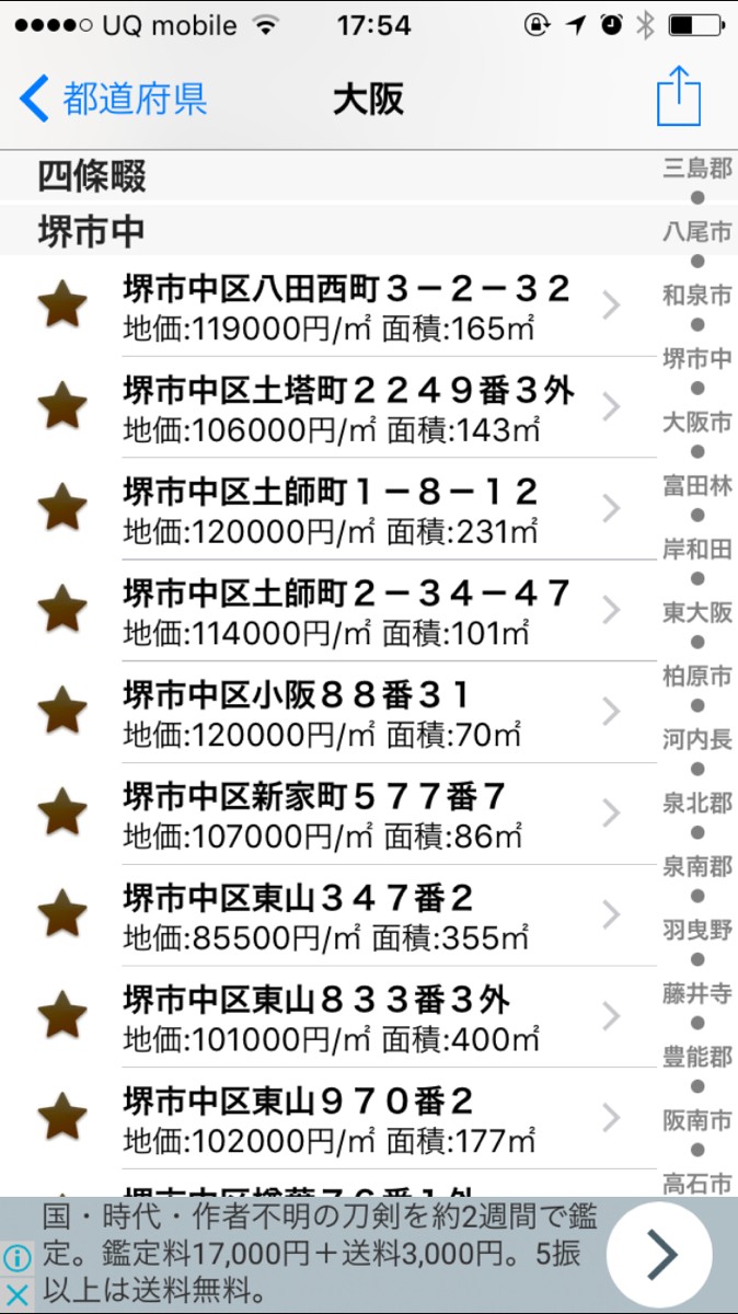 気になる地価情報は、「お気に入り」に登録しましょう。あとで登録した地価情報を「お気に入り」から一覧表示して、比較することができます。