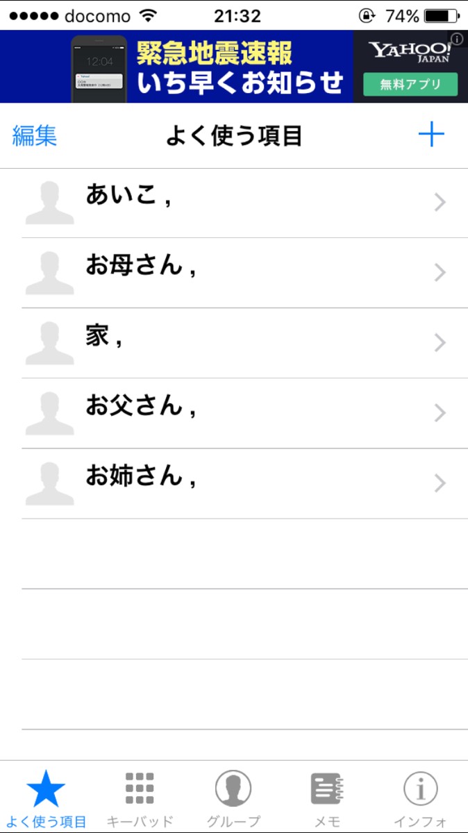 連絡する頻度が高い人を「よく使う項目」に登録しておきます。登録するときは画面右上にある「+」ボタンをタップして、すべての連絡先から登録したい人をタップするだけで完了です。