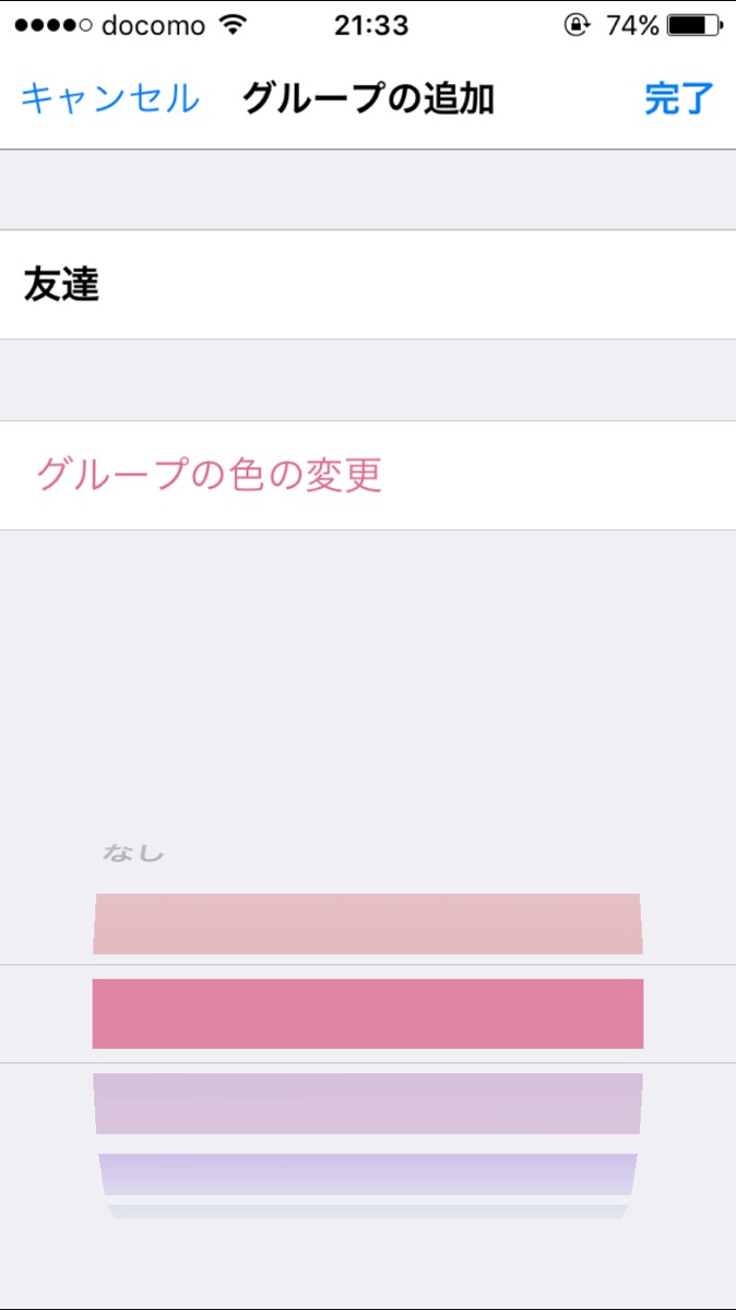 アプリと同期が終わったら、さっそく連絡先を整理します。まずは、画面下中央にあるグループ設定をタップしましょう。新規でグループを追加するには画面上の編集ボタンをタップします。グループ編集画面に切り替わったら、画面上にある「+」ボタンをタップしグループ名とグループの色を選択して完了ボタンをタップしてください。