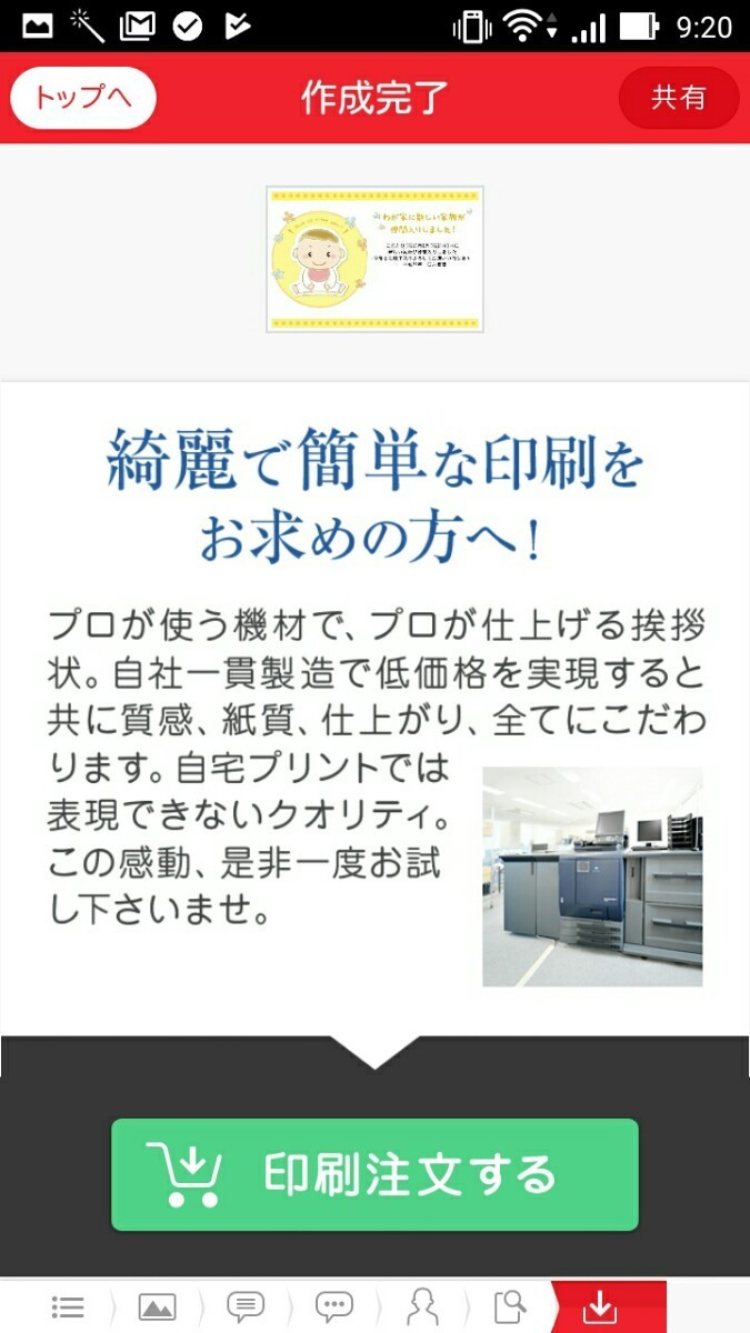 「自宅でカンタン挨拶状」で早速作成してみましょう。例えば、子供が産まれた時の誕生報告のデザインを考えてみましょう。商品選択の写真付通年挨拶状の誕生を選び、21種類のデザインの選択が可能です。お気に入りのデザインを決定したら、写真の選択をします。画質にこだわる人には「写真張り合わせ仕上げ」、価格にこだわる人には「プリンター印刷仕上げ」がおすすめです。自分の好きな写真をギャラリーから選び、枠に収まるようにトリミングを行います。写真は、モノクロなどの色に変更することも可能です。プレビュー画面で、完成した作品を再度確認してみましょう。次は、挨拶文を入れてみます。挨拶文は、定形文や自分のオリジナル文章を入れることが可能です。最後に一言コメントを添えたら完成します。作成完了画面の右側の共有ボタンでラインやTwitterなどへ送信が可能です。また、「自宅でカンタン挨拶状」では、宛名面を印刷することもできますよ。