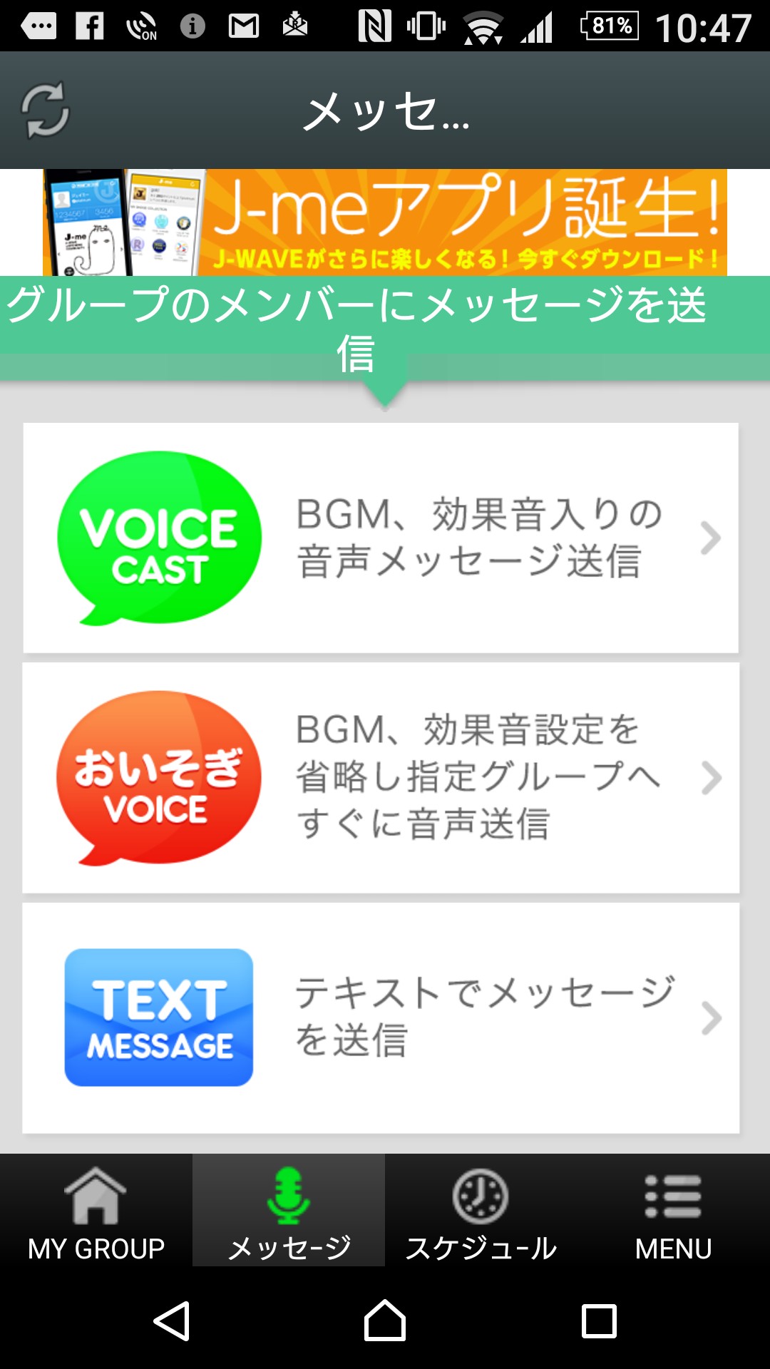 招待してグループ作成ができたら、メッセージの送信方法を選択します。笑い声の効果音やジャンルが豊富なBGMを取り入れたメッセージも作成できます。