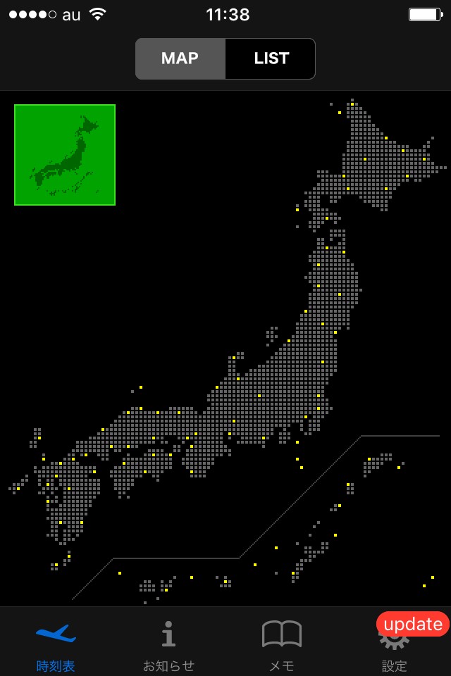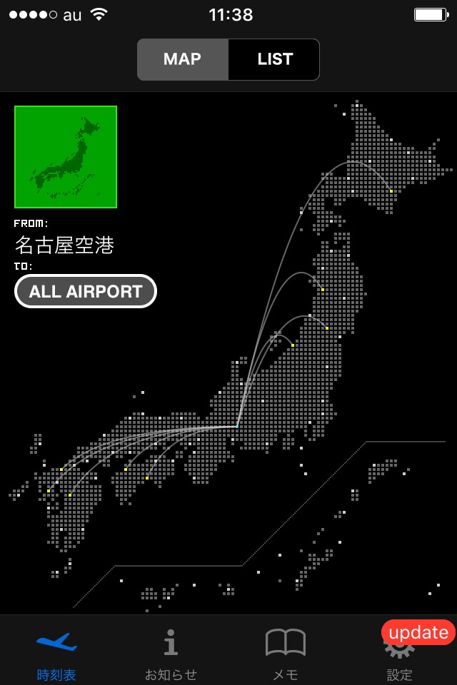 MAP画面ではデジタルな日本地図が表示され、それぞれの空港がある位置をタップすることで行き先がわかります。さらに到着予定地をタップすれば、飛行機会社や発着時刻がわかるようなシステムになっているのです。まだざっくりとした旅行計画しかない場合は、MAP表示の方が使いやすいかもしれません。