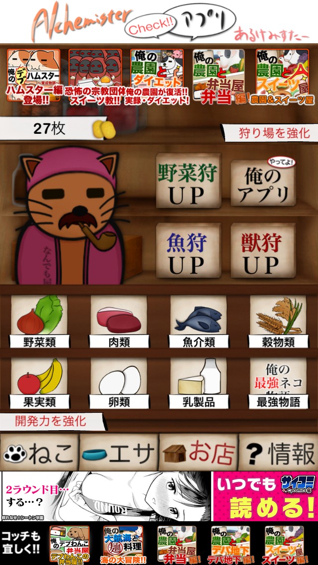 お店では狩り場を強化することができ、強化することでそのジャンルの食物を効率よく収穫することができます。また、エサの開発力を強化することで、食材をよりたくさん使用した高度なエサを開発できるようになります。