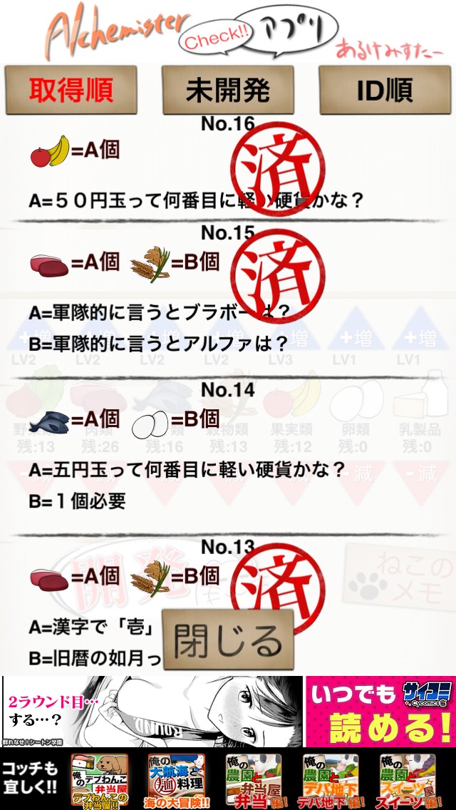 「俺のデブねこ物語」の根本的な目的としては、エサを与えてデブねこに育成することです。メインのねこページではねこにごはんを与えたり、食材の狩りをすることができます。エサページではエサの開発をすることができます。ただ、やみくもに食材を合わせて開発しても、食べれるエサは開発できません。そこで、このエサページにあるねこのメモを見ながらエサ開発のヒントを見て、新たなエサを開発することができます。ヒントを見ただけでは実際にどんなエサができるかわからないので、エサ開発はかなり好奇心をそそられます。