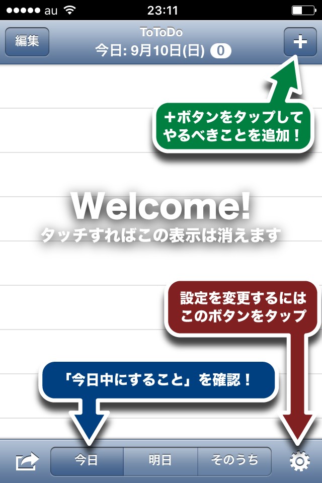 アプリ「ToToDo」に入力したタスクは、今日・明日・そのうちの3種類に分類することができます。的確に分類すれば作業が渋滞することもなくなるので、まずは自分の成すべきことをこの3つに分類することからはじめてみましょう。