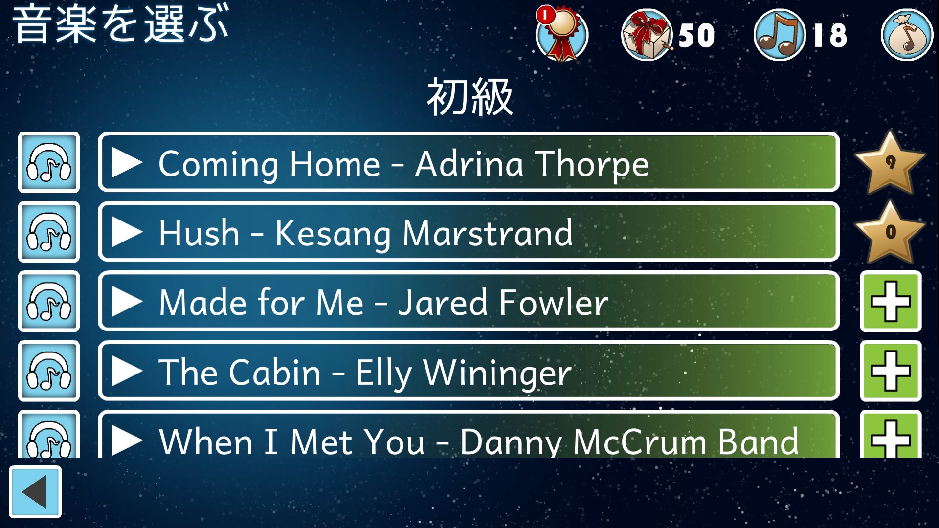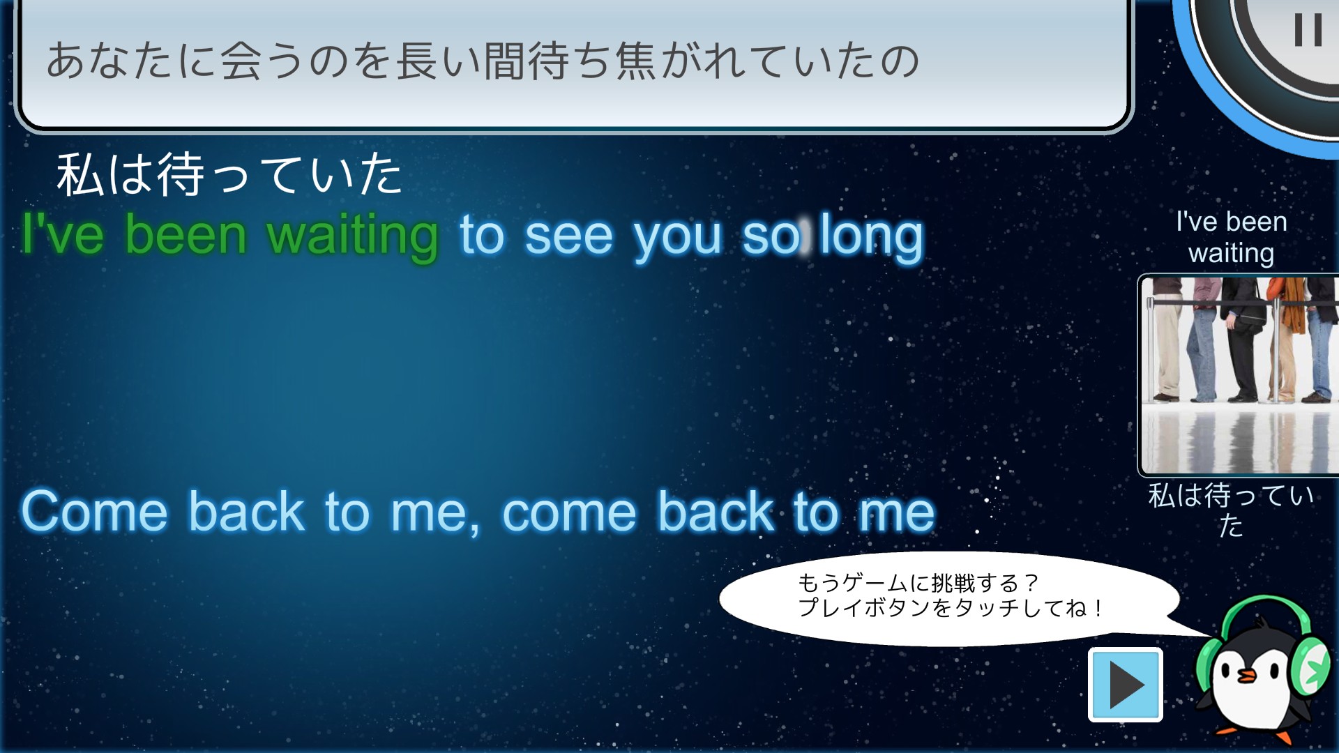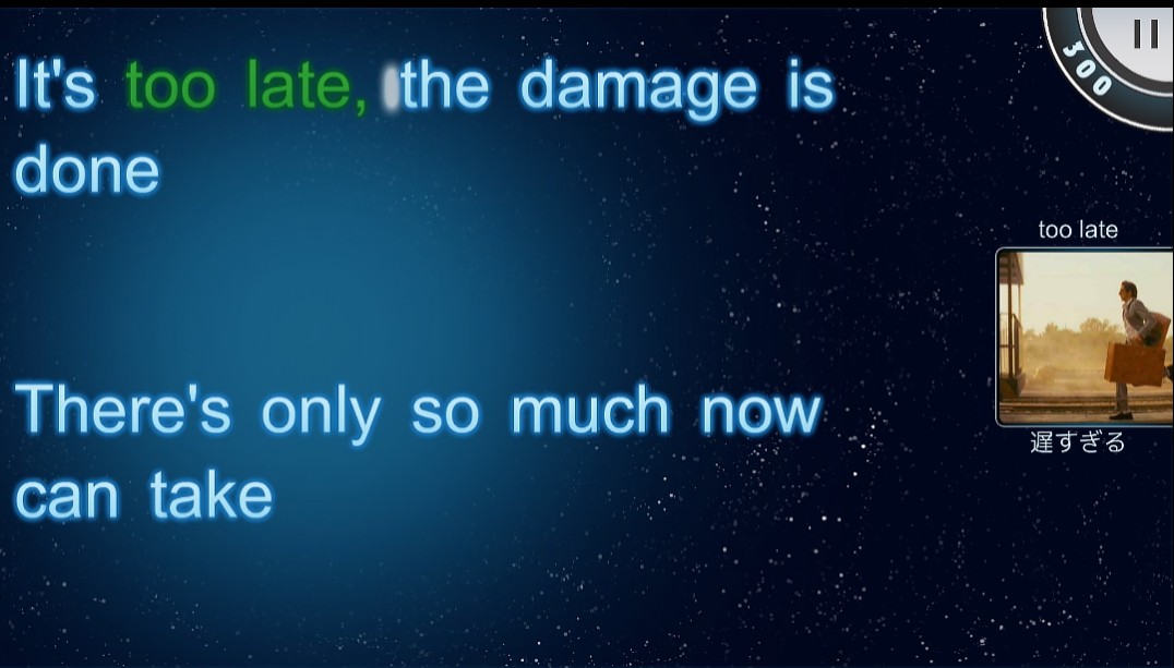 歌を聞きながら、表示された歌詞の抜けている部分を3つの選択肢から選んでタップします。