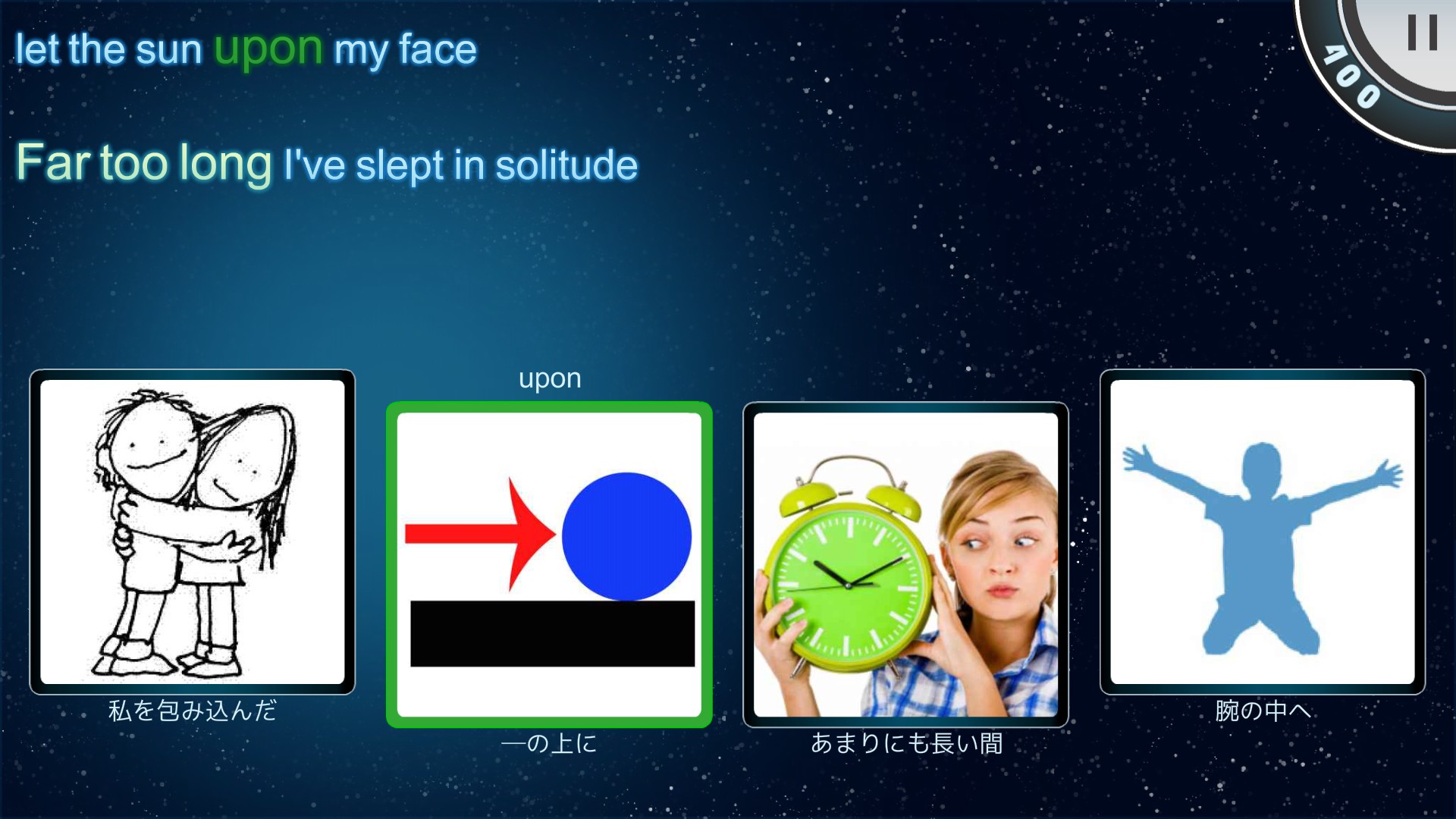 歌を聞きながら歌詞の中で黄色く表示された部分に合う絵を4つの選択肢から選んでいきます。歌詞や絵は歌に合わせて次々変化し、正解を早くタップするほど多く得点をもらえます。このモードでは主に単語力を身につけることができます。