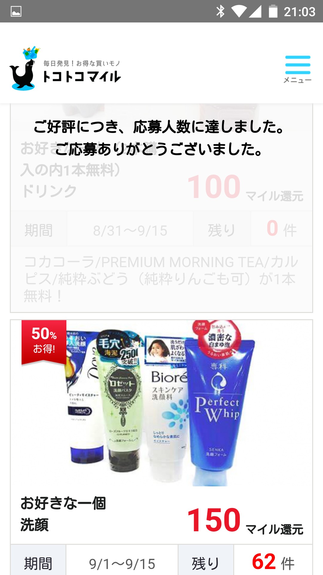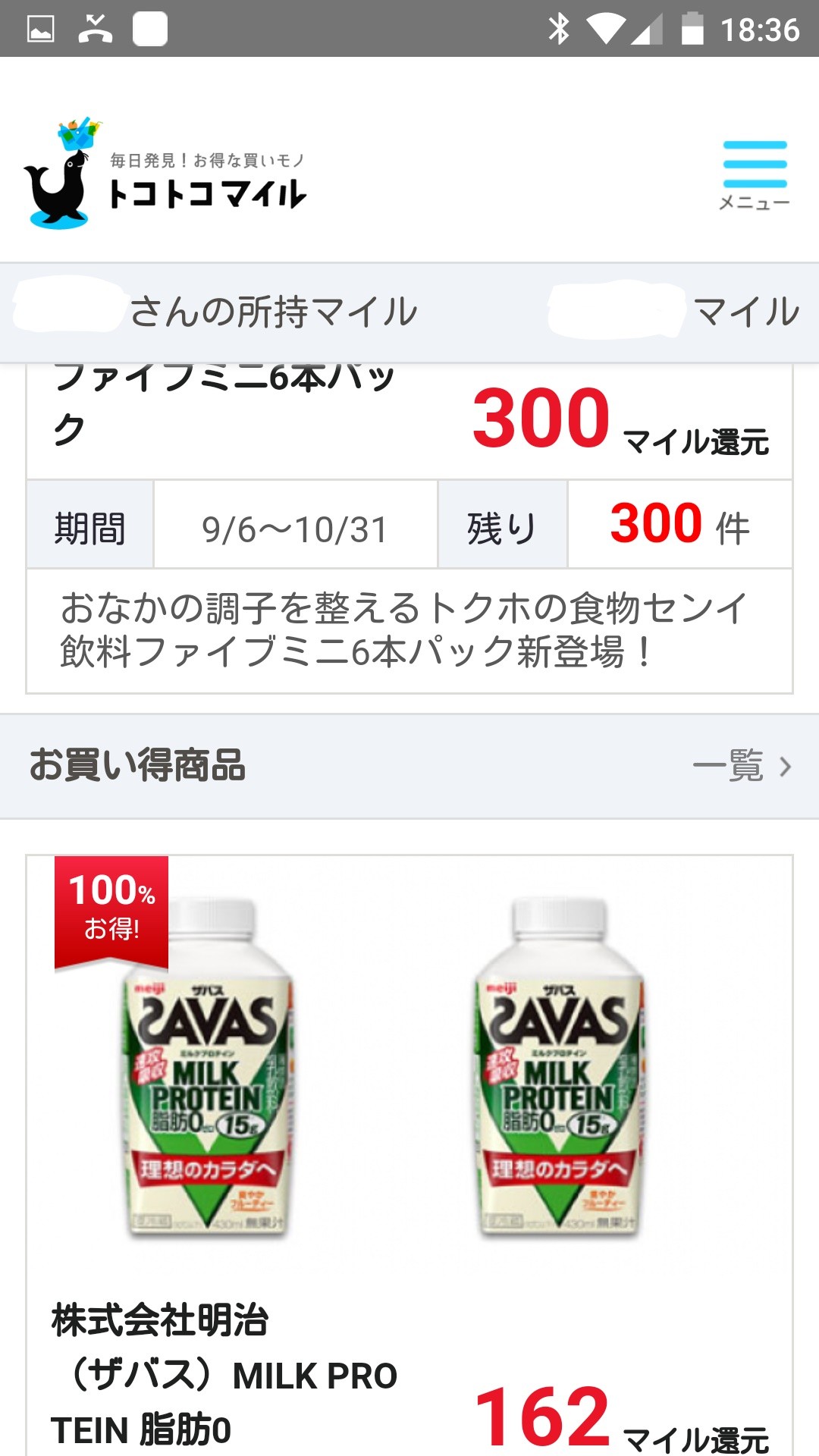 「トコトコマイル」は50%還元の商品が多いようですが、100%還元、つまり実質無料!なんて商品が出てくることも。