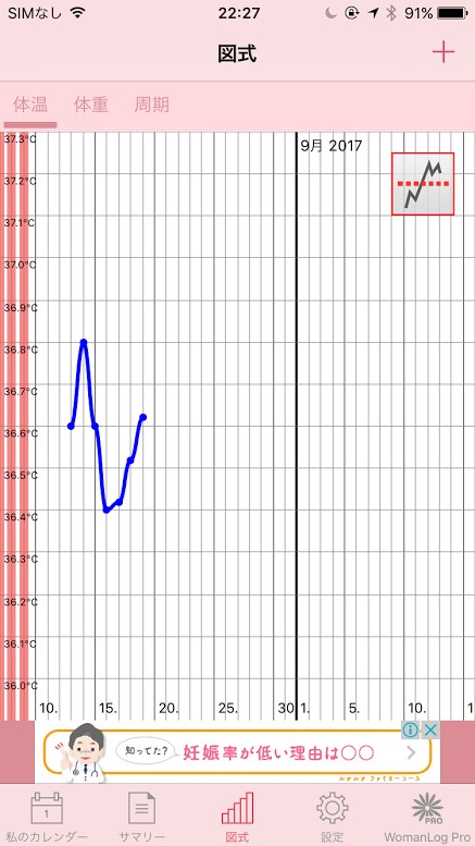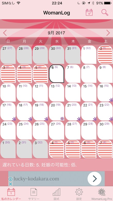 アプリの使い方は基本タップだけなので簡単に操作できます。アプリを開くと、画面下部に私のカレンダー・サマリー・図式・設定・WomanLog Proの5つの項目があります。私のカレンダーでは、毎日の体重を記録したり、基礎体温を記録したり、月経の周期を記録したり、体調を記録することでカレンダーに表示されるので、一目でその月の自分の身体のことを把握することができます。サマリーでは、月経周期や月経の平均期間など、過去3ヶ月〜1年までの平均値を見ることができます。図式では、毎日の基礎体温のをグラフで確認することができます。設定では、各設定を行うことができます。WomanLog Proは有料版の購入をすることができます。