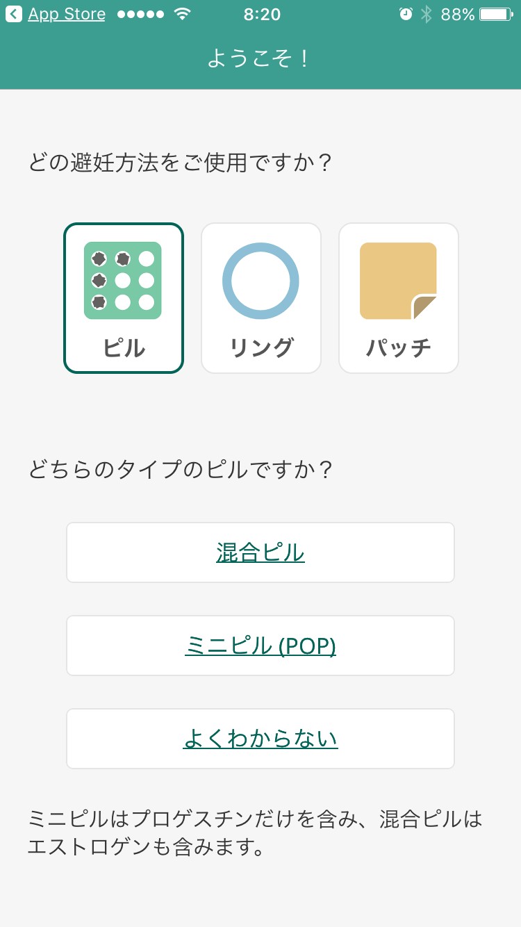 ①最初にピル、リング、パッチ、IUD、注射、どの避妊方法を使っているのかを選択します。