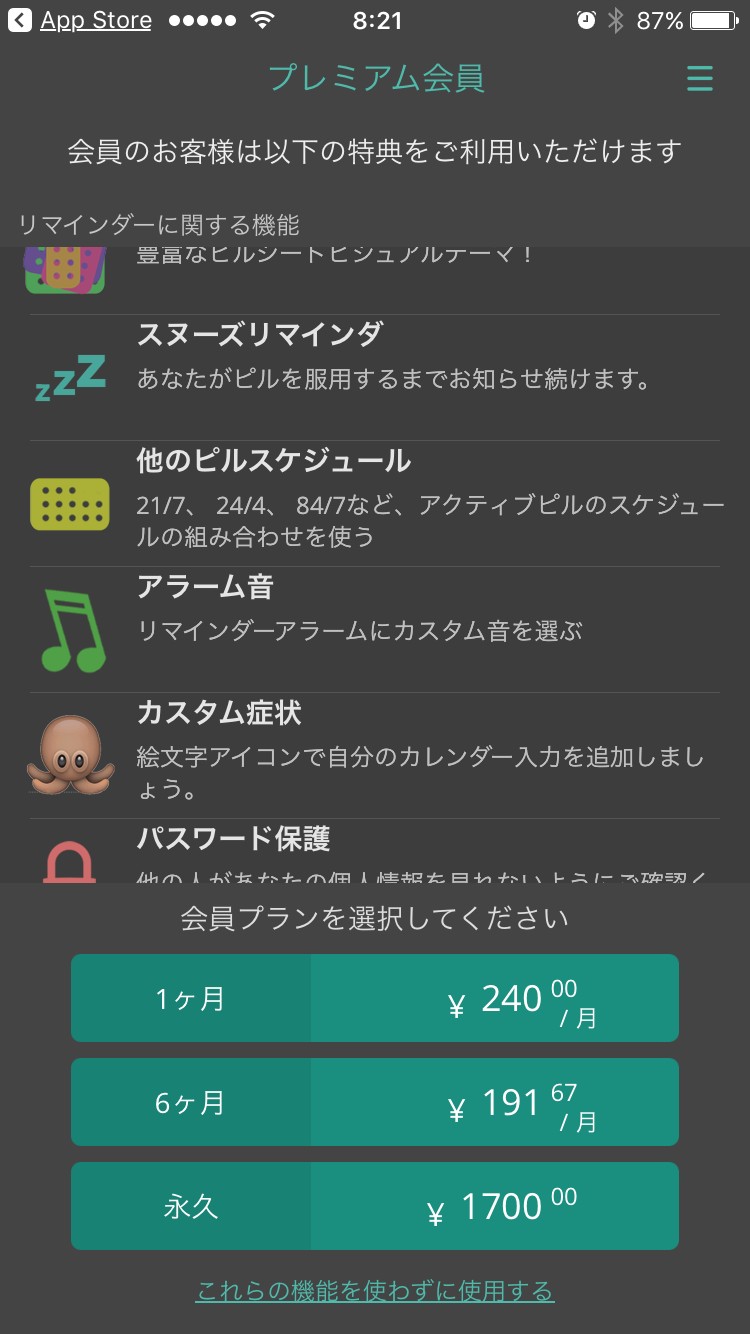 「myPill®」は無料で使えるアプリですが、有料でアップグレードすることもできます。会員価格は、1か月240円、半年プランで1,150円、永久会員で1,700円となっています。永久会員になるとかなりお得です。プレミアム会員になるとリマインダーとチャット両方の機能がアップグレードされます。