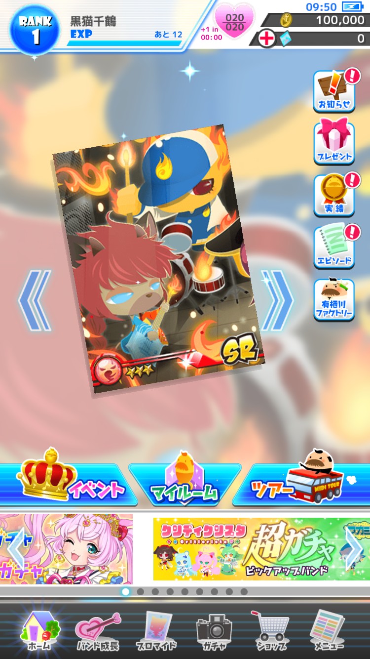 そちらでガチャを1回挑戦してみたところ…SRが出ました!これが「SHOW BY ROCK!!【爽快カジュアル音ゲー!!】」の中でいいのかどうなのかは、私には測り兼ねますが…。