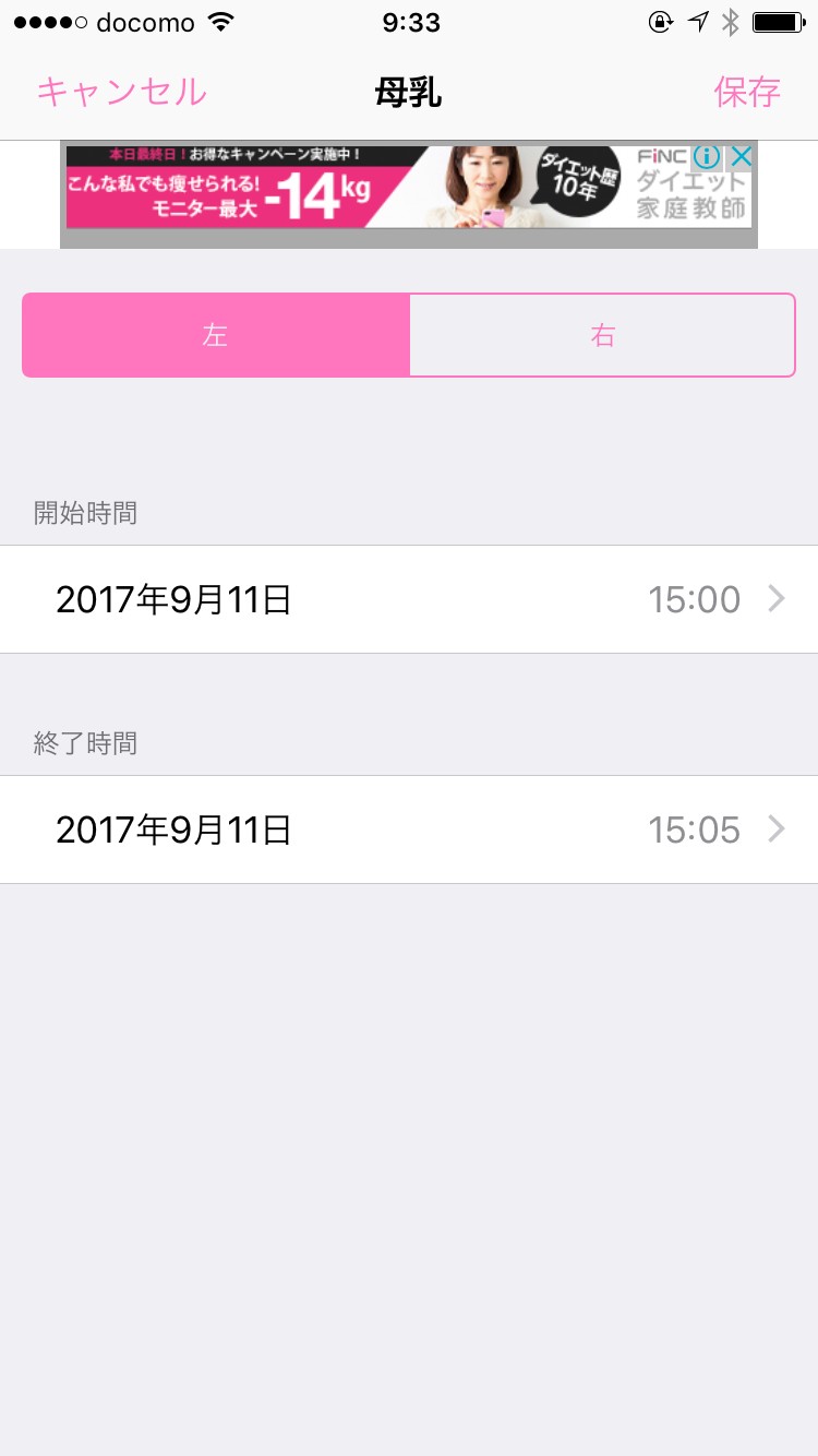 すると母乳専用の記録ページが開きます。左・右、授乳の開始時間と終了時間を入力するだけなので、何分かどうか計算する手間も省けますね。母乳以外のページも入力しやすいよう工夫されているので、是非お試しください!