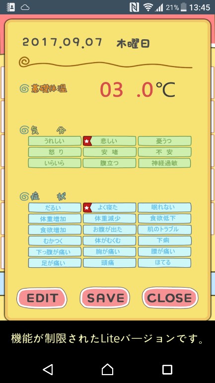 「Supreme生理ダイアリー Lite」アプリなら、生理日予測や排卵日予測だけではなく、基礎体温、その日の症状、気分、体調、メモなどをSupreme生理ダイアリーに記録しておくことが出来ます。記録しておけば後で確認することも可能ですし、生理周期における自分の体調変化もしっかりと理解することが可能になります。