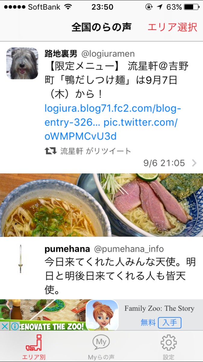 2.アプリを起動すると「全国のらの声」のタイムラインが表示されます。ツイートをタップするとラーメン店の情報や店舗紹介が表示されるので、気になった店があったらチェックしてみましょう。