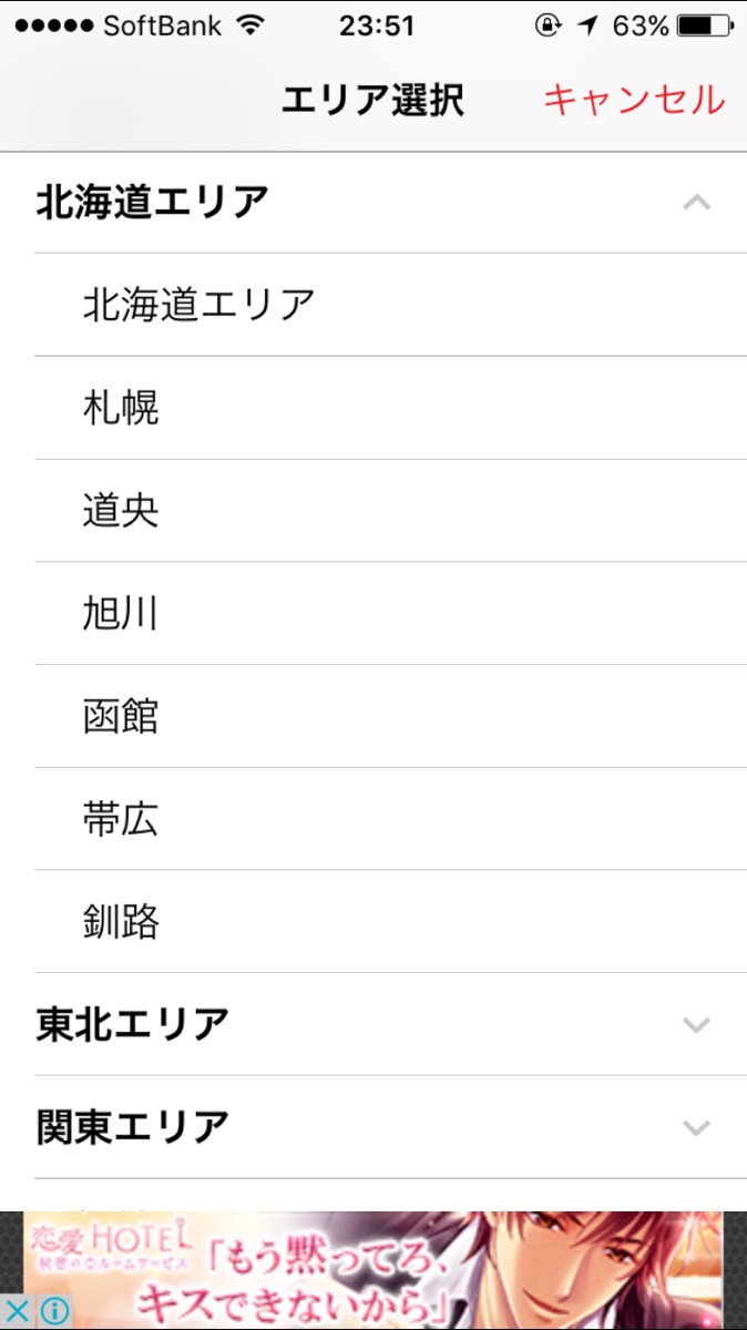 3.右上の「エリア選択」をタップするとエリア選択が可能です。都道府県からさらに詳しい地域の選択まで可能なので、欲しい情報がピンポイントで見つかります。