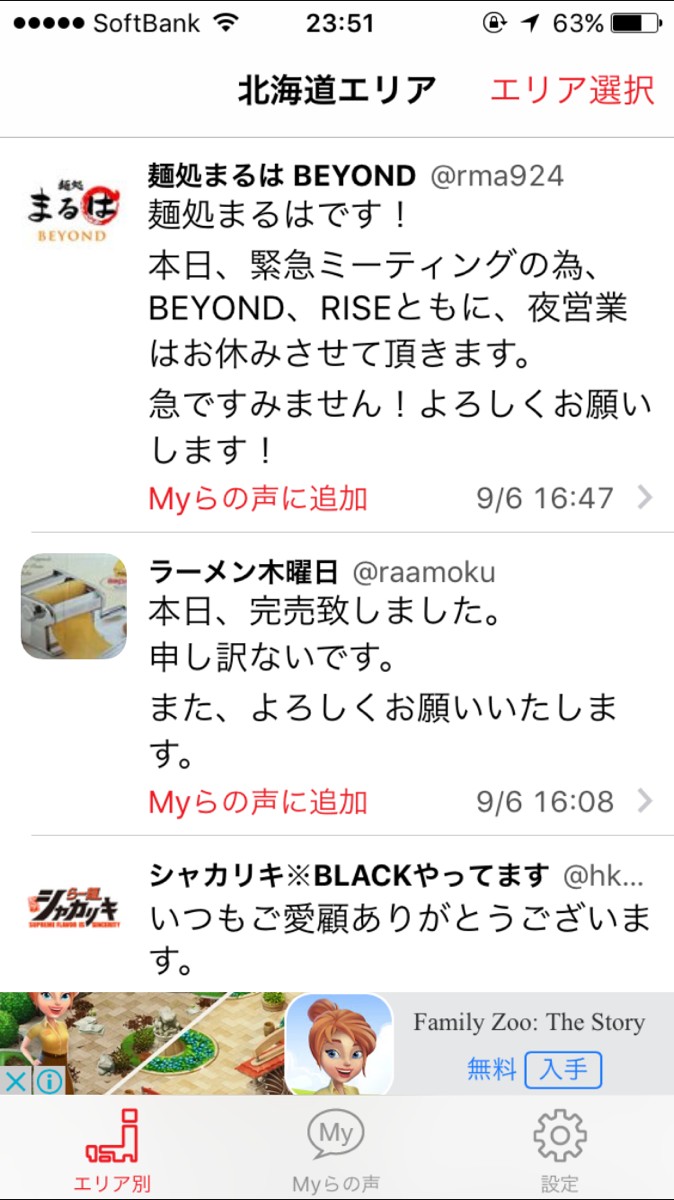 といった点が「らの声 - ラーメン店の生の声をお届けします」のおすすめポイントです。北は北海道から南は福岡まで、ラーメンが有名なエリアを中心に対応しています。ラーメン店のおすすめ商品やその日限定のお得な情報がいち早く手に入れられるでしょう。また、全国のラーメン店のタイムラインを上から見るのは大変ですが、市区町村までエリアを絞ることでピンポイントな情報を見つけられます。さらにお気に入りのラーメン店のつぶやきだけを表示してくれる機能もあります。タイムラインから「Myらの声に追加する」を押すと、お気に入り登録されるので試してみましょう。特に気に入った店舗やこれから訪問予定の店舗を登録しておくと便利ですね。