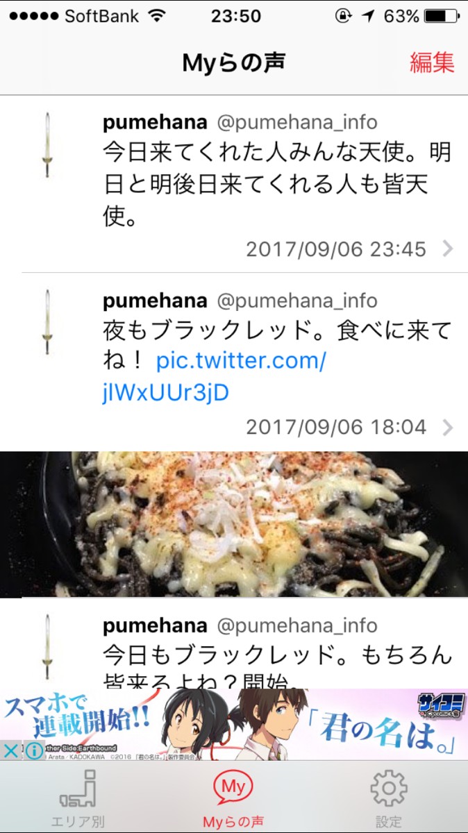 4.画面下の「Myらの声」を利用するには、タイムライン上の「Myらの声に追加」という赤字を押しましょう。登録すると、お気に入りのラーメン店のつぶやきだけが表示されます。