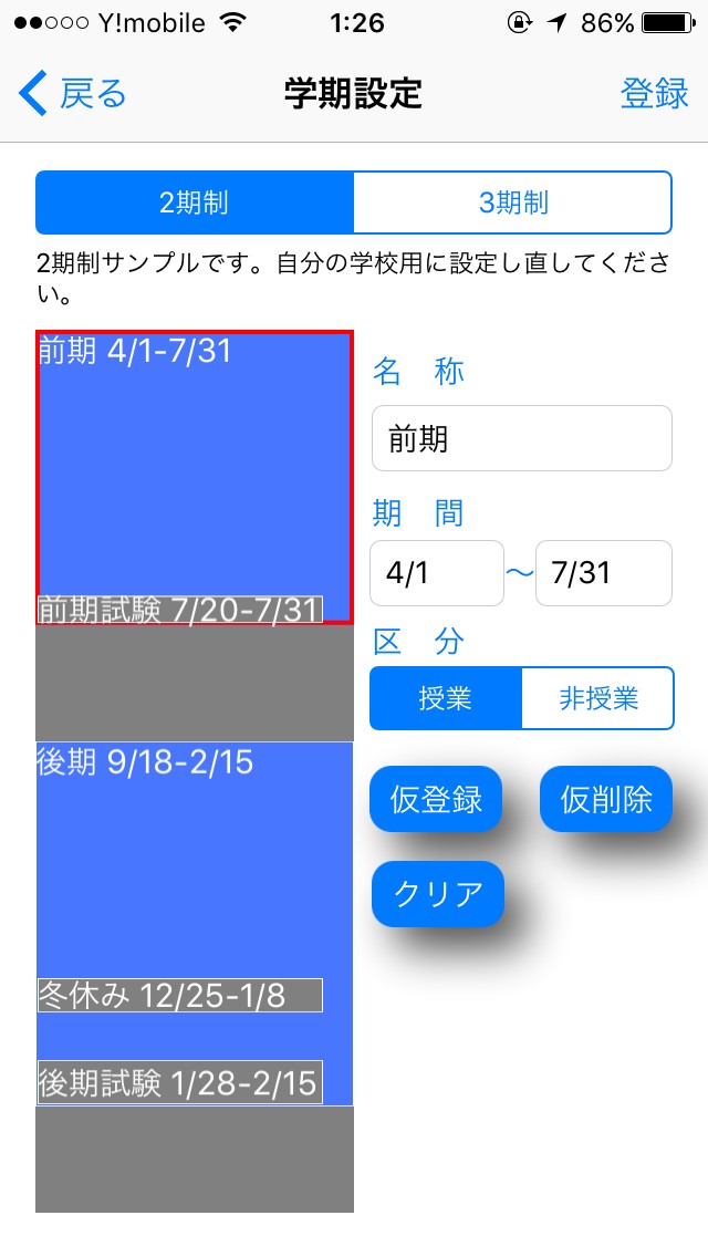 自分の通う学校は何学期制なのかを入力し、その後その学期数に合わせて学期の節目や期末試験等の大きなイベントの時期、夏休みなどの長期休暇などを細かく設定することができます。