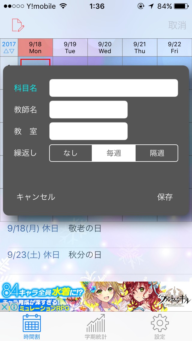 自分用にカスタマイズする必要があったり自分で一から作成したい場合は各曜日のコマごとに画面をタップしてそこに一つ一つ時間割を割り振ってきます。