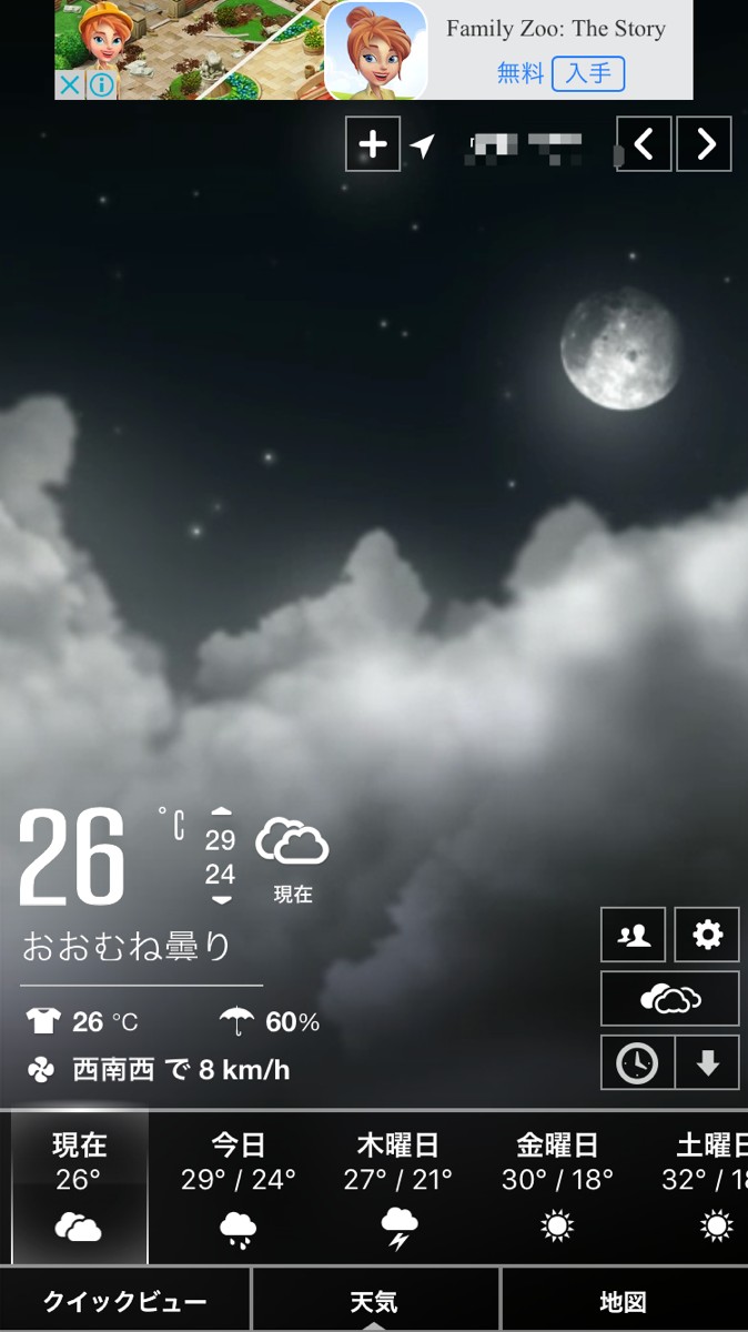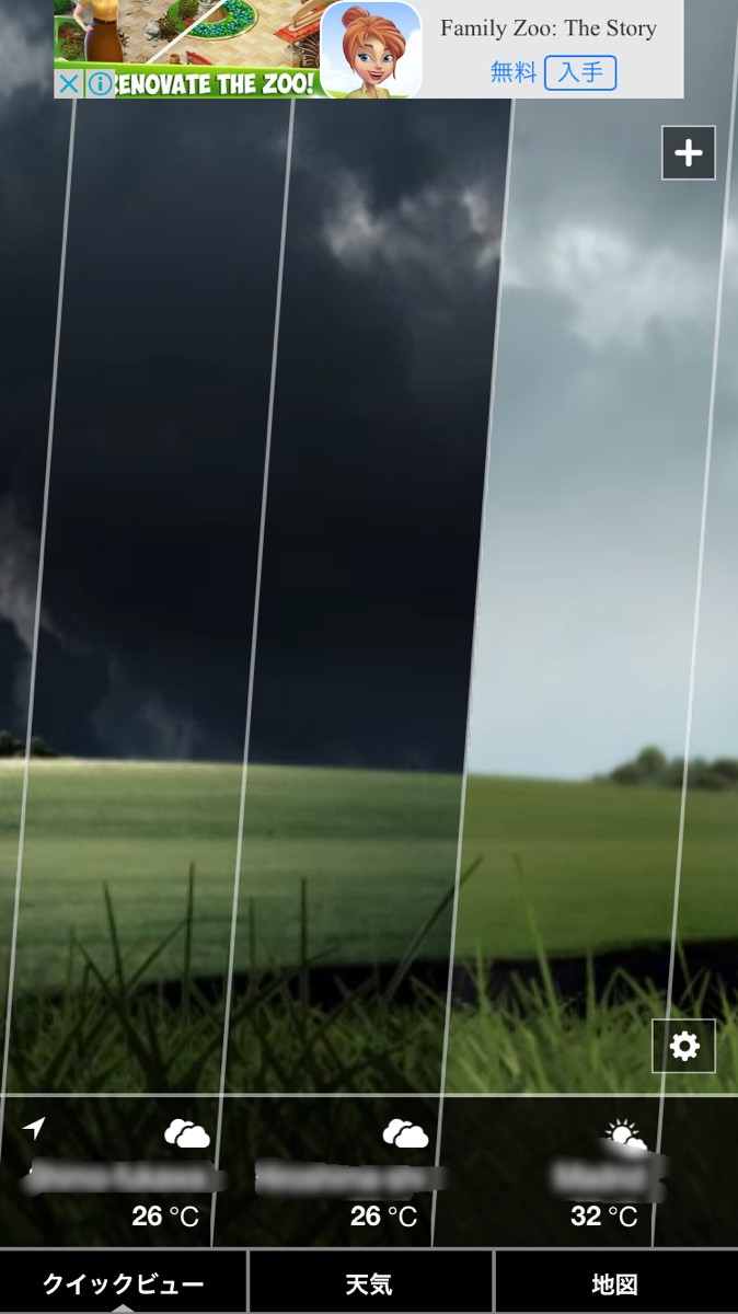 3.「クイックビュー」は登録した地点の天気が一括表示されます。「天気」の画面と同じようにアニメーションで表示されるので分かりやすいですね。なお、無料版の登録は3か所までです。それ以上登録したい場合は有料版を購入しましょう。