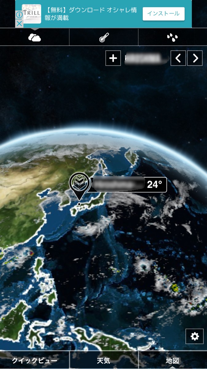 4.「地図」を開くと地球が表示されます。地球上にかかる雲の様子や雨の強さが確認できます。