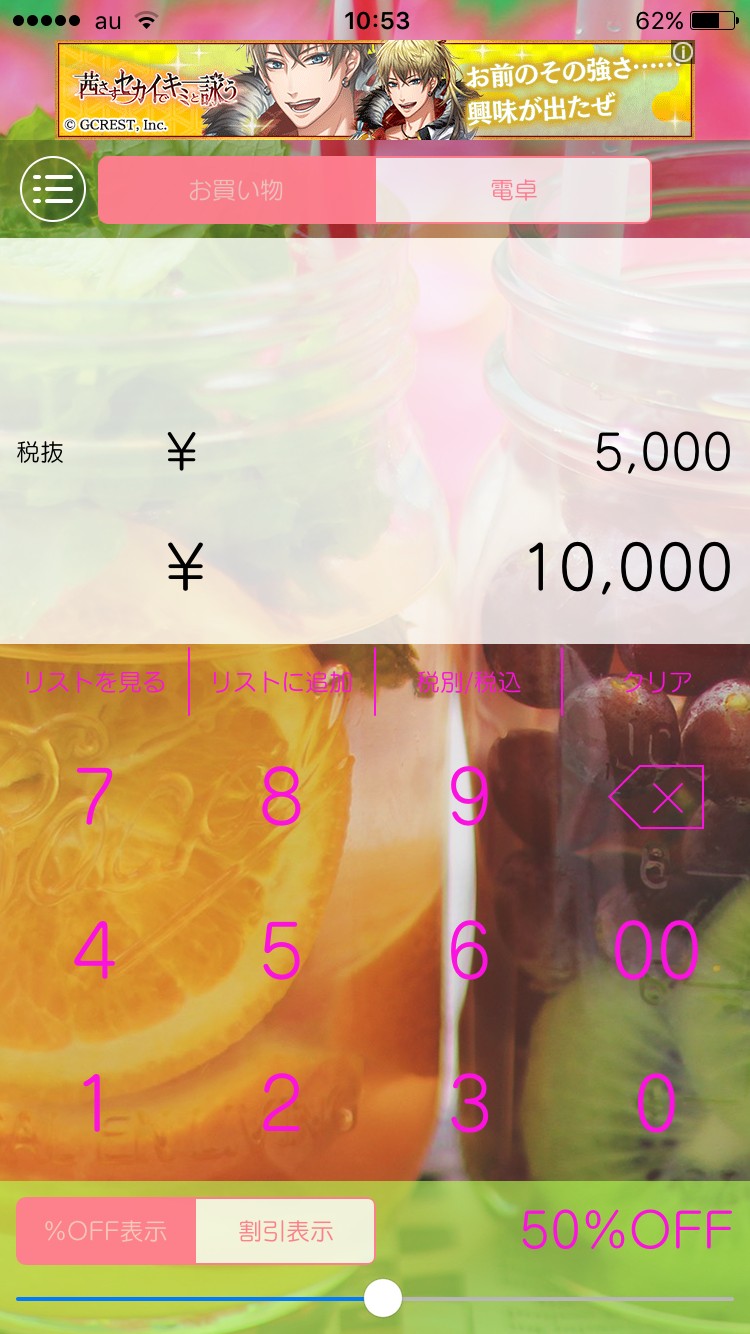 普段、買い物の計算などで電卓アプリを使用することが多くはないですか?このとき意外と面倒なのが割引の計算です。金額を入力した後、いちいち数字を掛けたり割ったりしなければなりません。でもこのアプリなら金額を入力すれば、後は画面下部にあるバーを横にスライドさせ割引率を変化させるだけで簡単に割引の計算が出来ます。例えば10,000と金額を入力し割引バーを50%OFFにスライドさせれば、割引後の5,000という金額が簡単に出ます。しかも「%OFF表示」と「割引表示」の2パターンが用意されているので、わかりやすく簡単。画面上部にあるモード選択で「お買い物」モードから「電卓」モードに変更すれば、通常の電卓画面での計算も可能です。