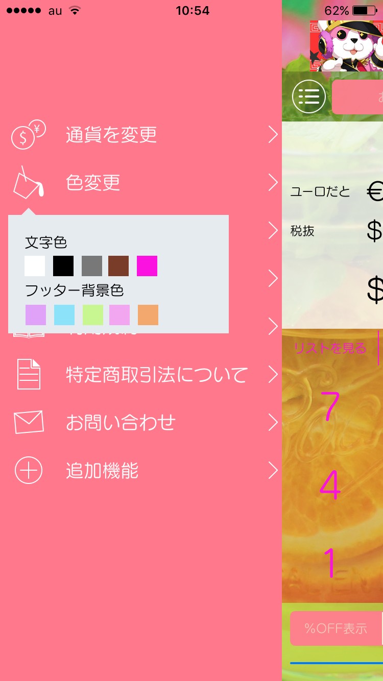 このアプリでは元からかわいい背景画像素材が用意されていますが、メニュー画面の「背景画像変更」から、なんと自分のスマホのアルバムからお気に入りの写真や画像を電卓画面の背景に設定することも可能です。それだけでなくメニュー画面の「色変更」から文字の色、フッターの背景色も自由に変更可能です。背景画像に合わせて好きな色を設定することで、友達にも自慢できる、かわいくておしゃれな自分だけの電卓を作ることが出来ます。