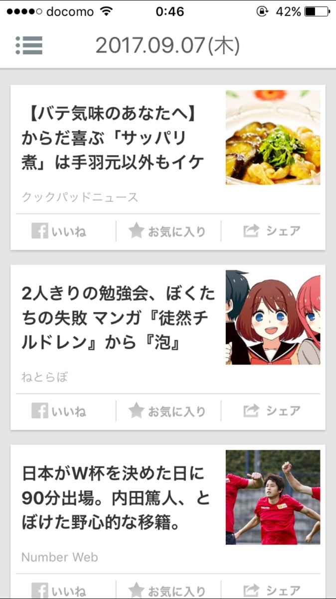 気になった記事を見つけたら「お気に入り」ボタンを押してください。「お気に入り」ボタンは記事タイトルの下と、本文の下にある星マークです。お気に入り登録した記事は、ホーム画面左上のボタンをタップすると出てきます。