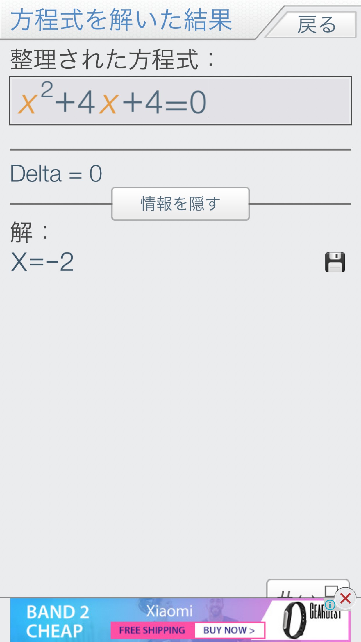 上記をアプリで計算すると、”x = -2”と答えを出すことができます。