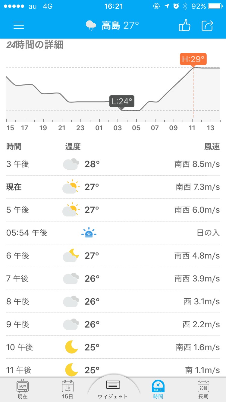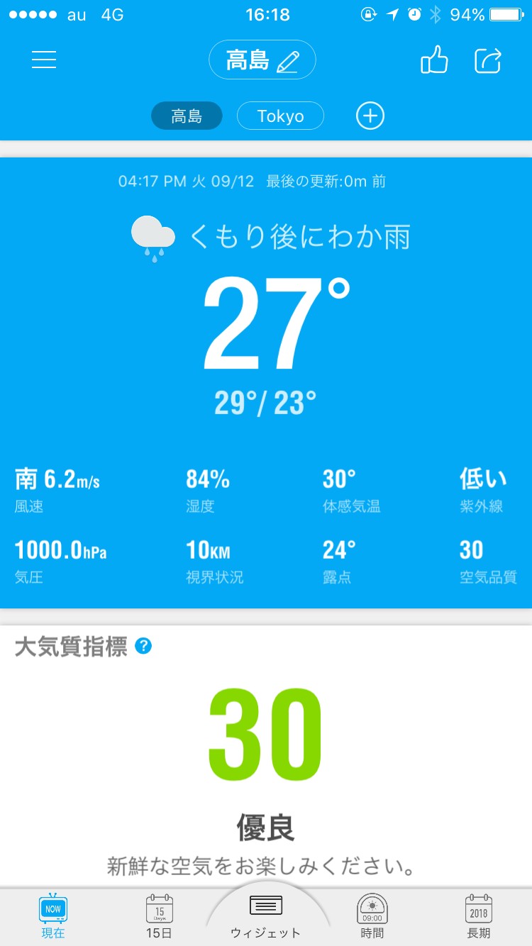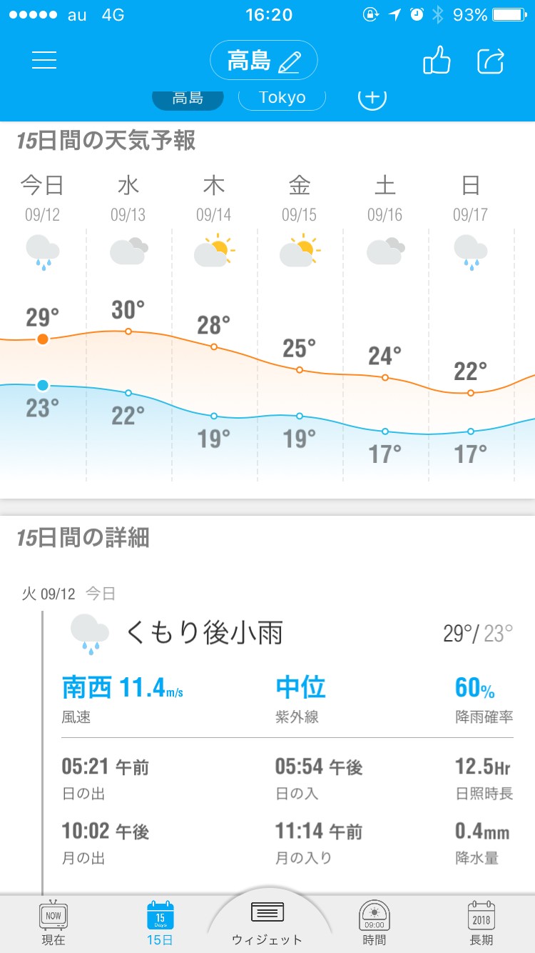 タブで分類されており、今日・15日間・毎時の天気をそれぞれの地域でお知らせしています。