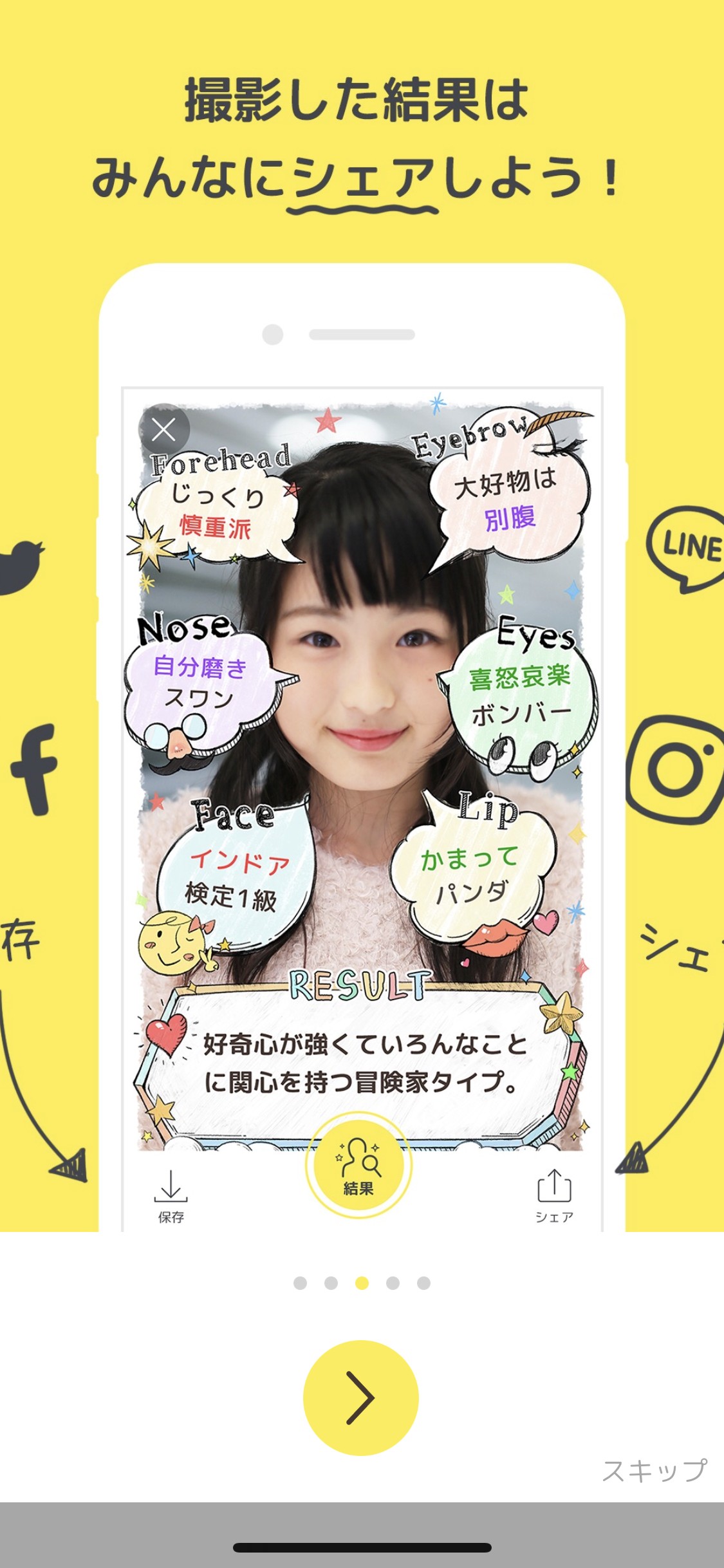 「charame - 人相占い」は、カメラ機能で顔を撮影し、各パーツを解析することで人相占いができるアプリです。鑑定結果の画面では、撮影した顔の周りにパーツ別のコメントが表示され、その下には性格や思考に関する短くてわかりやすいコメントが表示されます。鑑定結果の表示方法がかわいくて無料でも充分楽しめますが、アプリ内課金をするとさらに詳しい鑑定結果を見ることもできます。
