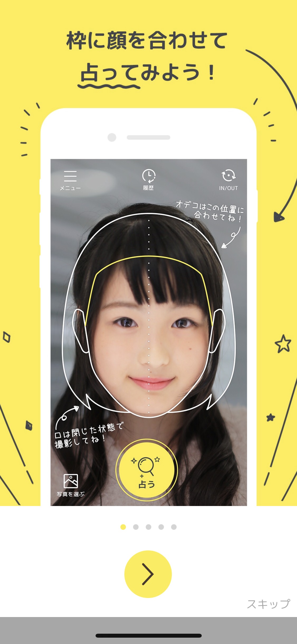 - 画面の指示に従って顔を枠内におさめ、「占う」をタップ。