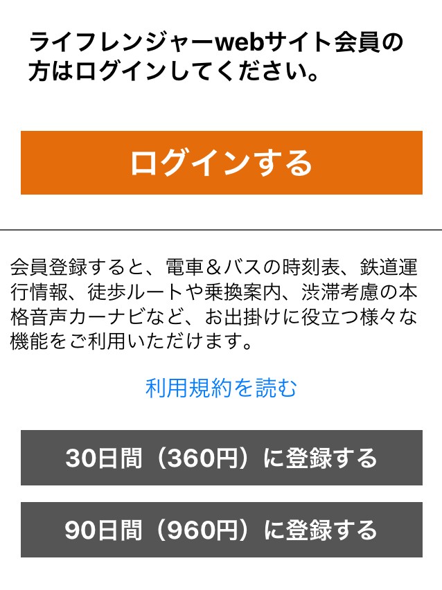 先に紹介した「ライフレンジャーナビ -渋滞予測カーナビ&徒歩+乗換&バス時刻表アプリ」の機能は無料で利用することができますが、会員登録するとさらに便利な機能をご利用頂けます。