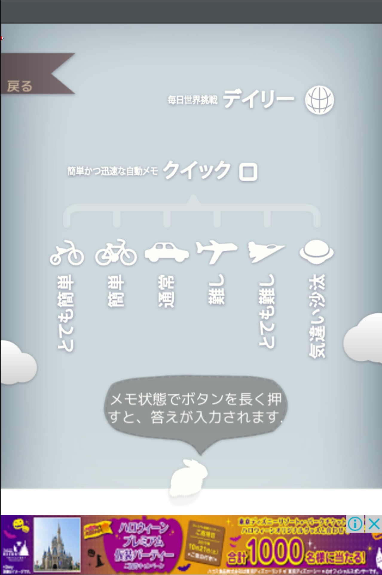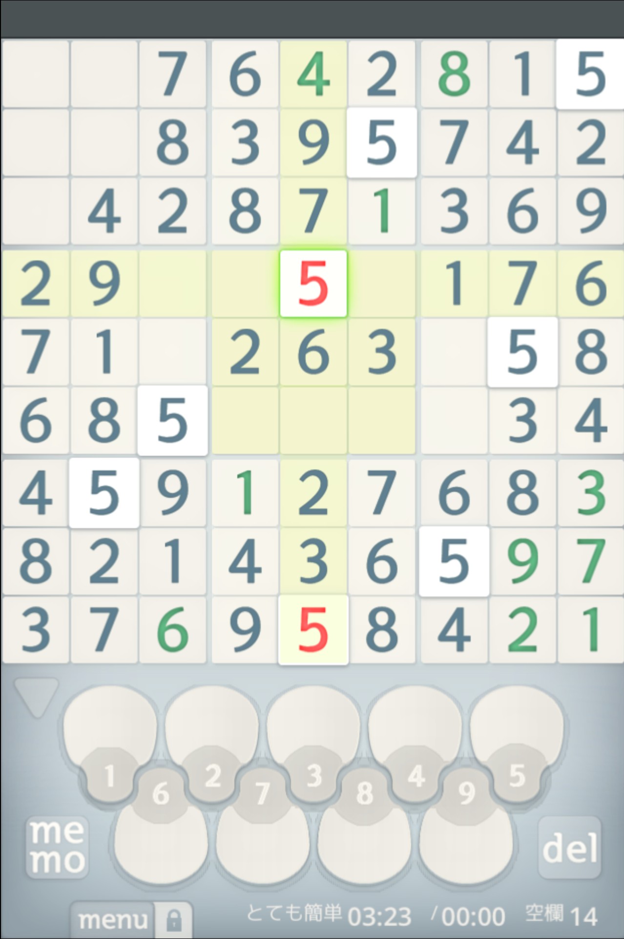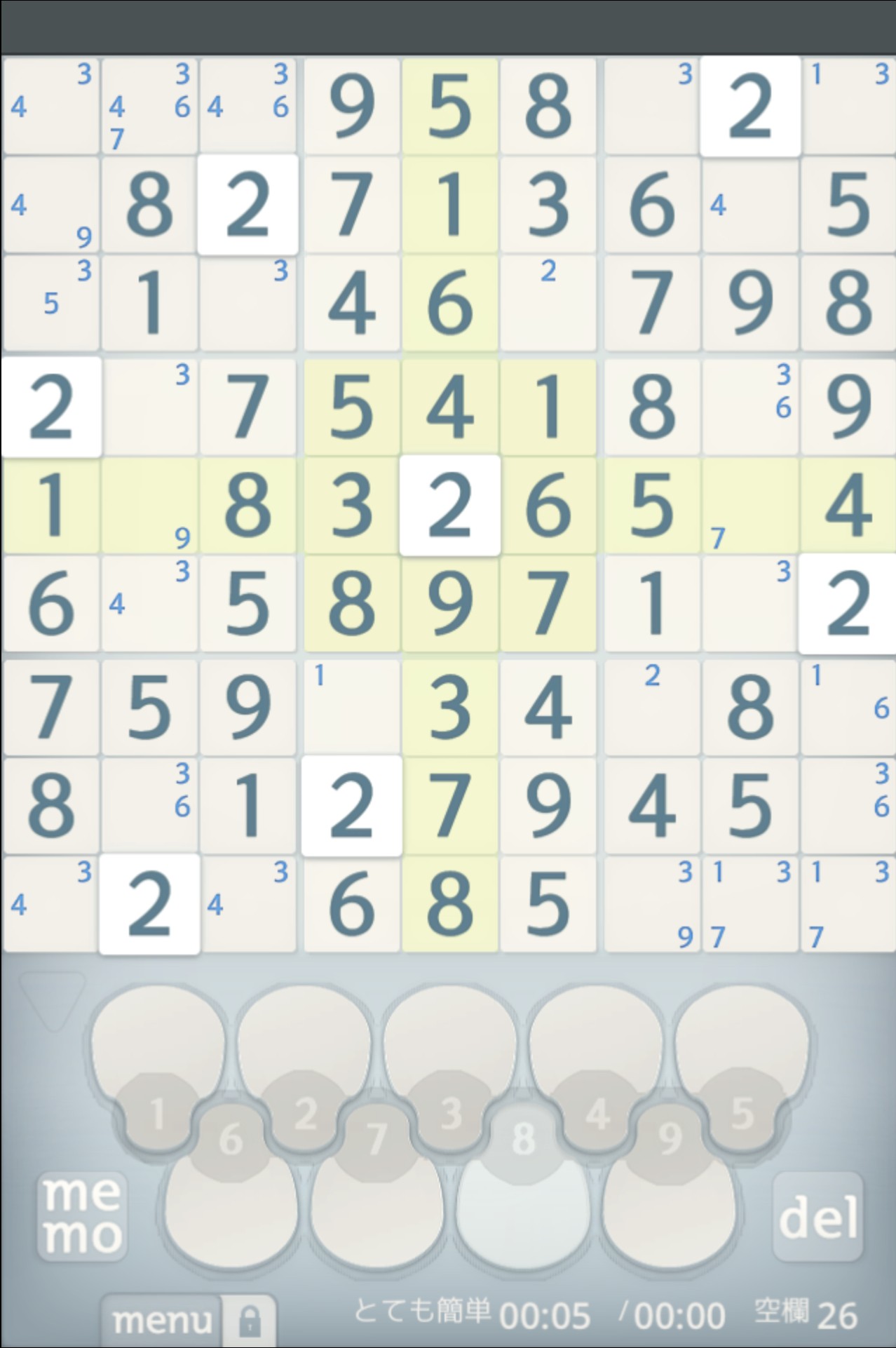 memo:アプリ左下「memo」をタップ後、テンキーをタップすると、マス内に小さな文字で数字をメモ書きできます。