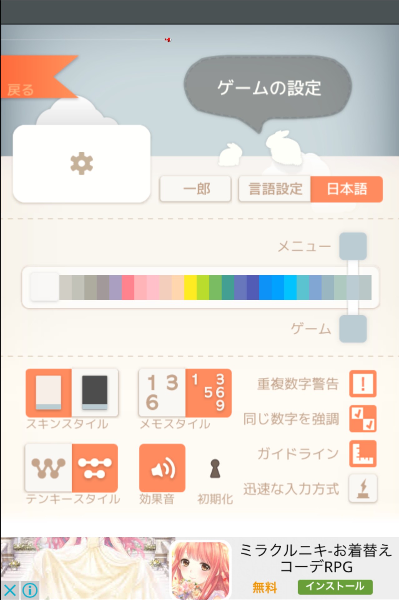 ゲームが難しいと感じる方は、「クイック」機能をオンにすると、全マスにヒントが与えられた(候補となる数字がメモ書きされた)状態でゲームをスタートできます。