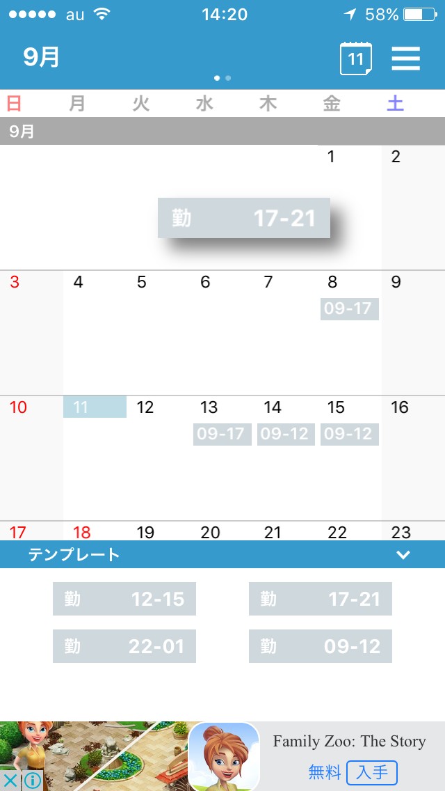 シフトを登録する方法は、カレンダーの日付をタップして入力する方法と、事前に作っておいたシフトのテンプレートをカレンダーにドラッグ&ドロップして入力する方法があります。シフトのテンプレートは、画面右上のリスト表示ボタンから「テンプレート - 追加」をすることで登録できますよ。