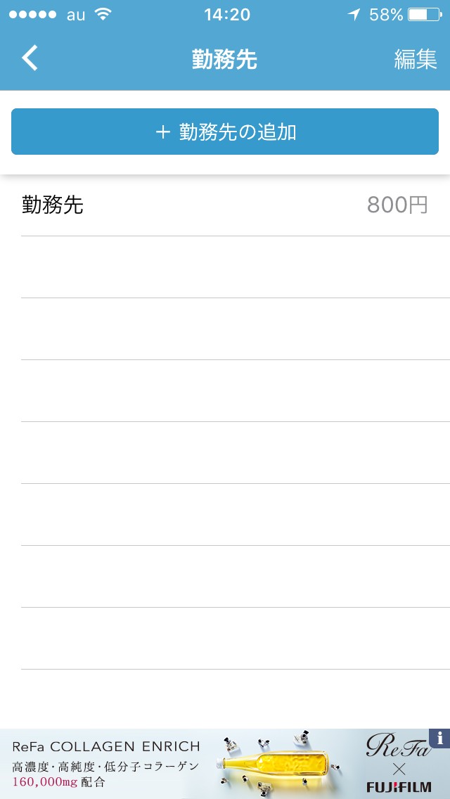 カレンダー画面を左方向にスワイプします。画面右下の「勤務先」をタップし勤務先と時給を登録しましょう。