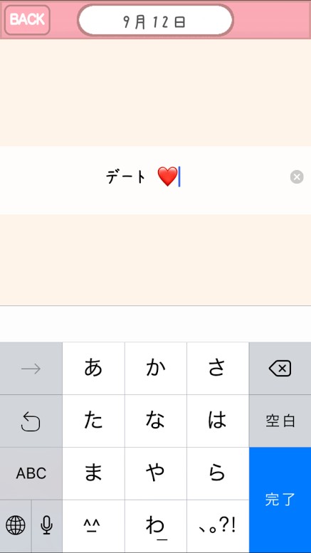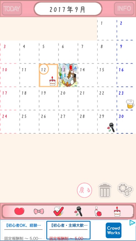 アプリの操作方法はいたってシンプルです。よくあるカレンダーアプリと操作方法は変わりません。アプリを起動するとカレンダーが表示されます。あとは、自分のスケジュールをカレンダーに入れていくだけです。可愛いスタンプは、画面下部に配置されており、左からハートスタンプ、リボンスタンプ、ビールスタンプ、マイクスタンプ、ボーリングスタンプ、ケーキスタンプがあります。スタンプの種類はこれだけなのですが、考えを変えればいろんな使い方ができます。例えば、リボンスタンプはショッピングとしても使えますし、友達とランチとして自分で決めていればランチとしても使えます。自分の使いやすいように予定を入れてみましょう。