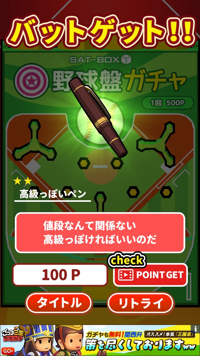 試合をしたり、ログインボーナスを貯めることでポイントが貯まります。貯まったポイントでガチャを回して、新たなバットやユニフォームをゲットしましょう。ゲットしたアイテムはオリジナルチーム作成の際に使用できます。