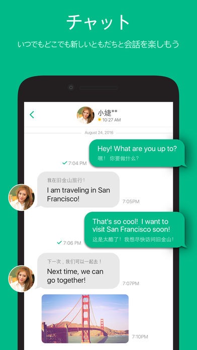 ホーム画面で右から左にスワイプすると、設定している地域のいま繋がれる人を検索してくれます。どんどんスワイプして、会話したい人を探してみましょう。翻訳機能があるので、気軽に日本語で話しかけてみてください。