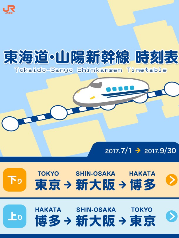 「JR東海 東海道・山陽新幹線時刻表」では、下り(東京→新大阪→博多)と上り(博多→新大阪→東京)ともに時間帯毎に発車時刻を確認することができます。