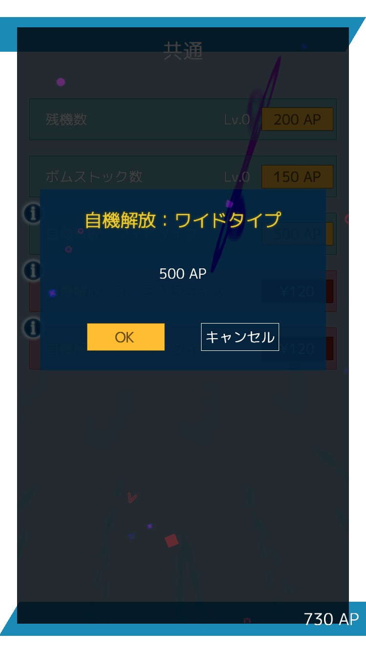 そのため、500APまでは貯めて「ワイドタイプ」の自機を早く開放することを目指した方が、その先のステージクリアがスムーズです。
